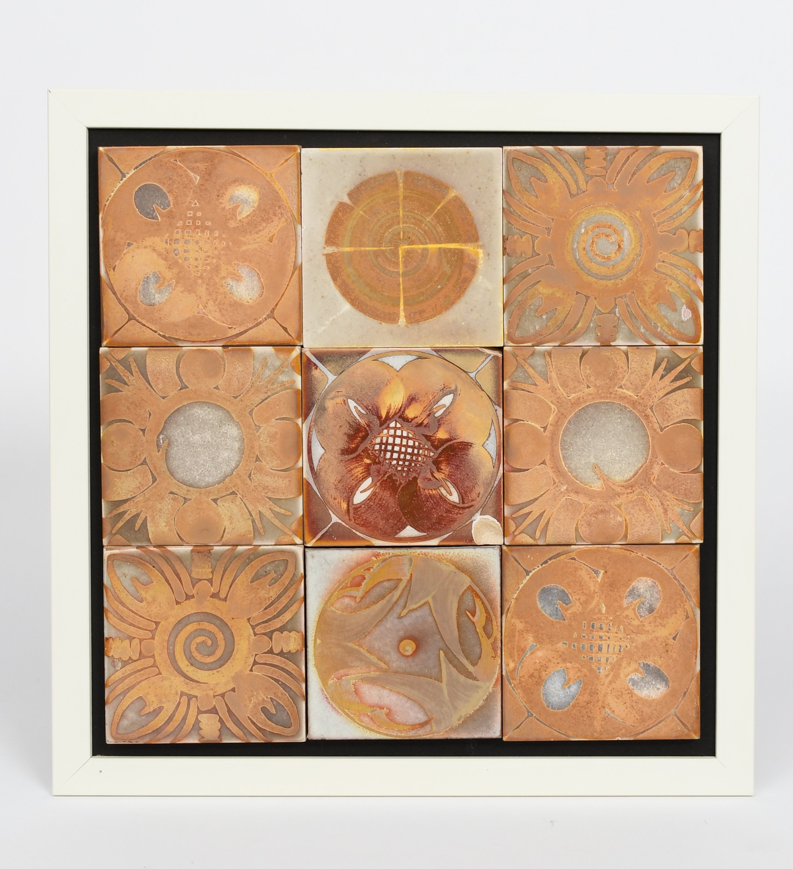 an Aldermaston Pottery nine tile panel, dated 2007, each tile painted with a stylised flowerhead or geometric design in ruby and golden lustre, framed