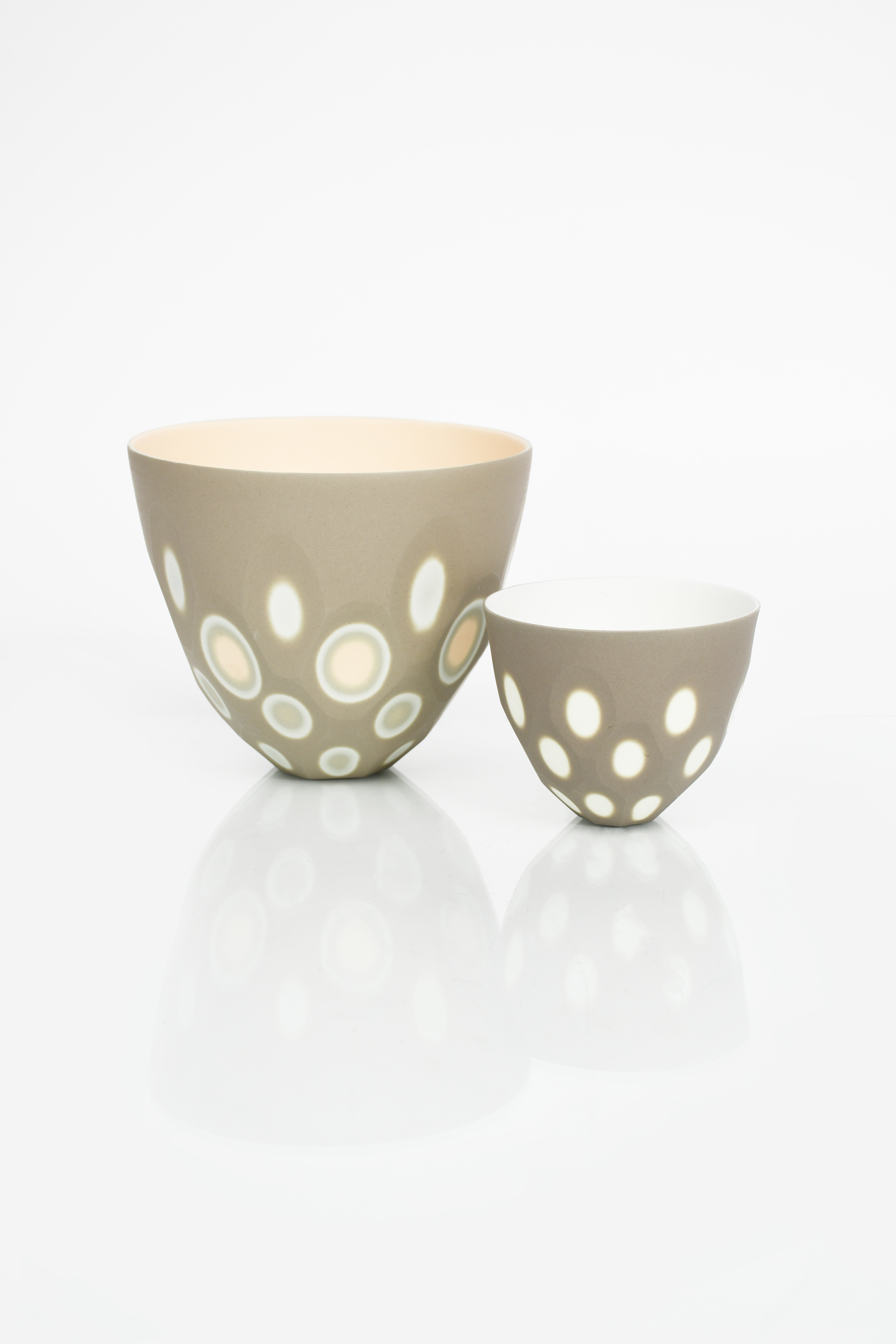 a multi-layered porcelain bowl, the tapering body with faceted lower section, apricot, cased in white and sepia taupe, and another smaller