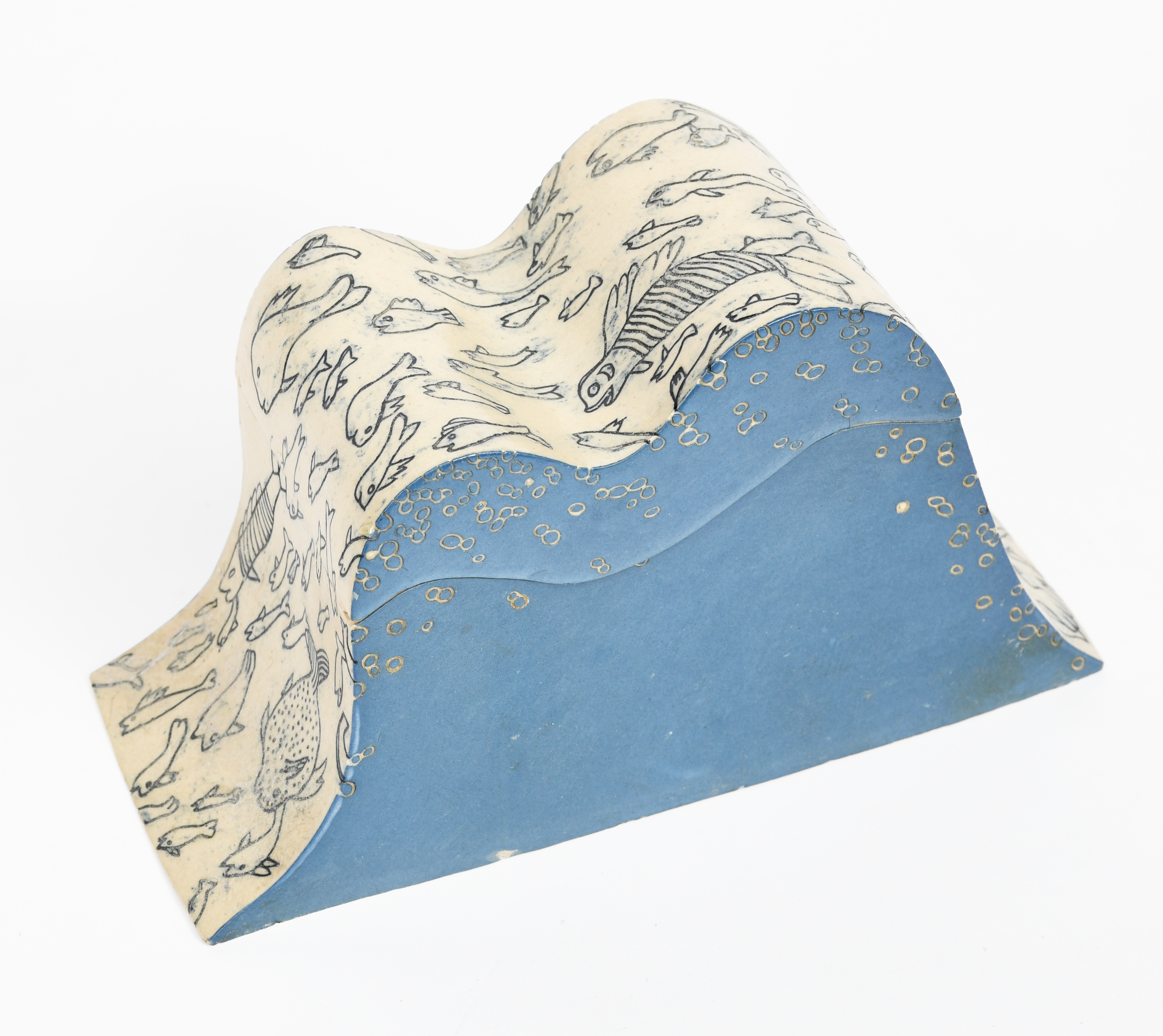 an early box and cover, circa 1974, rectangular tapering section with wavy rim and top, incised with seals and fish, glazed in cream and blue