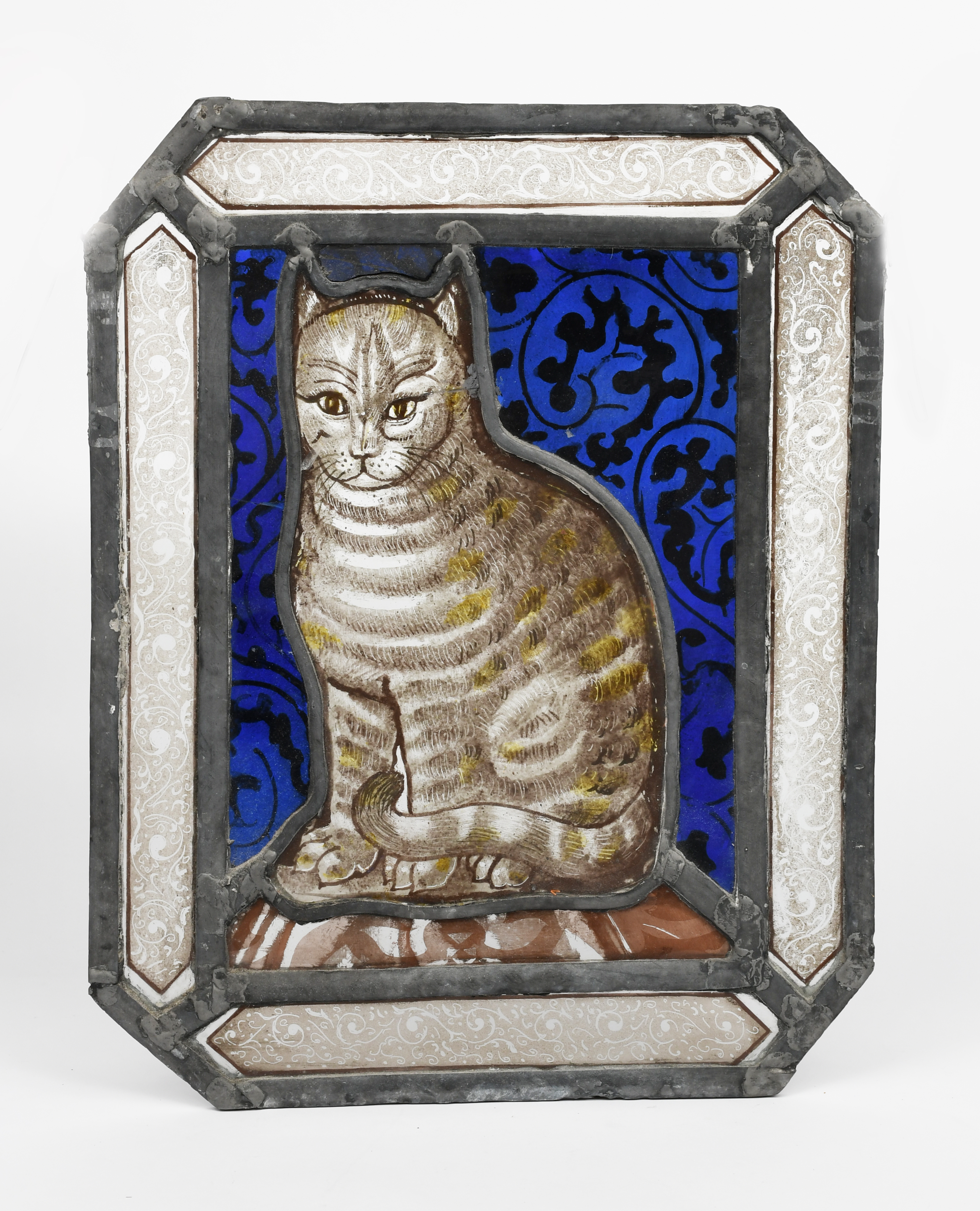 A small stained glass window depicting a seated cat, shaped rectangular form, the central panel depicting a seated tabby cat, inside scrolling foliate panels, and a small printed glass window titled 'Ric Whittington', dated 1979, unsigned, main panel cracked, 40.5 x 32cm. (2)