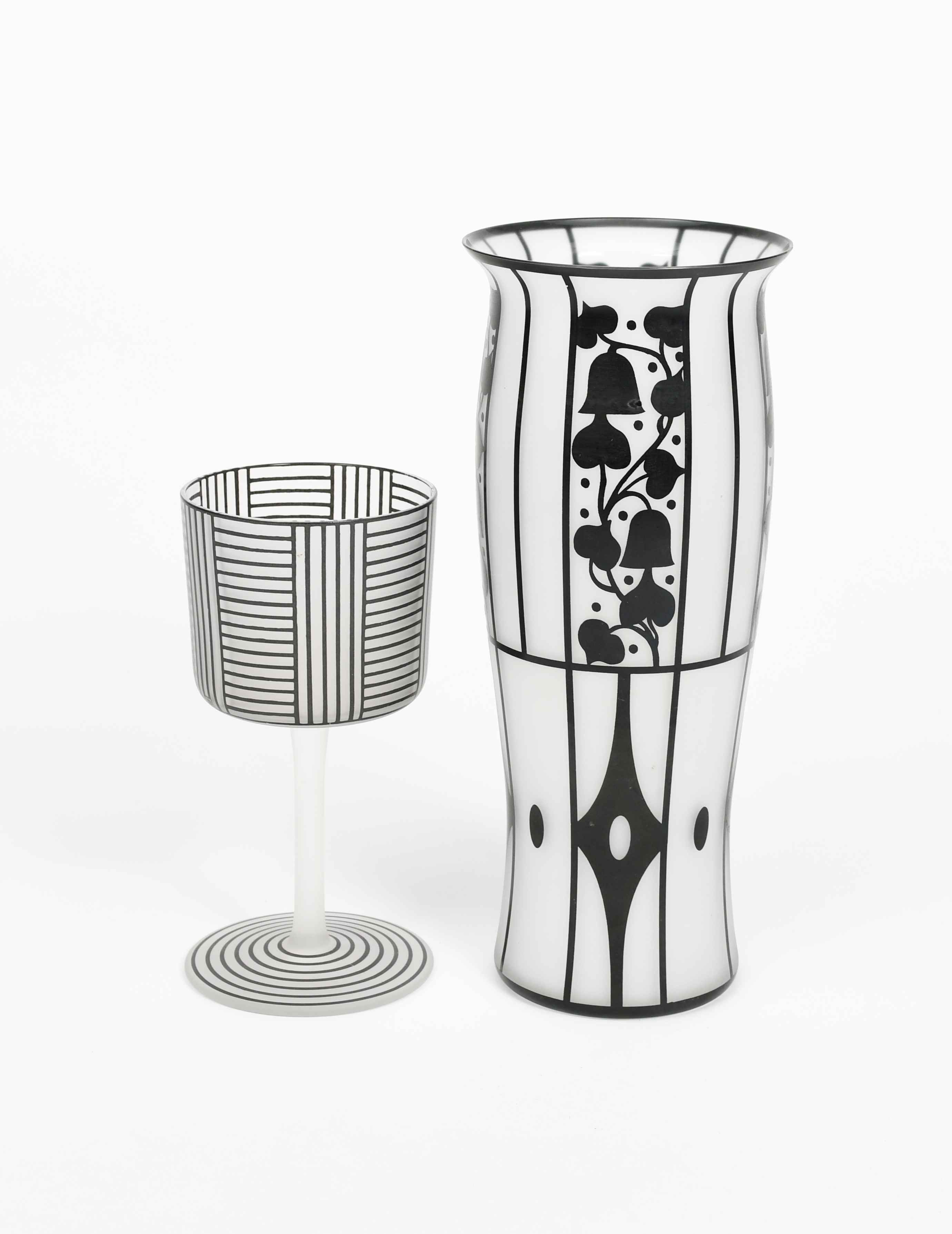 A modern glass vase after the design by Josef Hoffmann, swollen cylindrical form, decorated with black foliate and geometric panels, a modern Series B wine glass originally designed by Josef Hoffmann, decorated with geometric panels, and a Rosenthal Studi Linie glass Art Nouveau style bowl glass with printed monogram, 20cm. high (vase), (3)