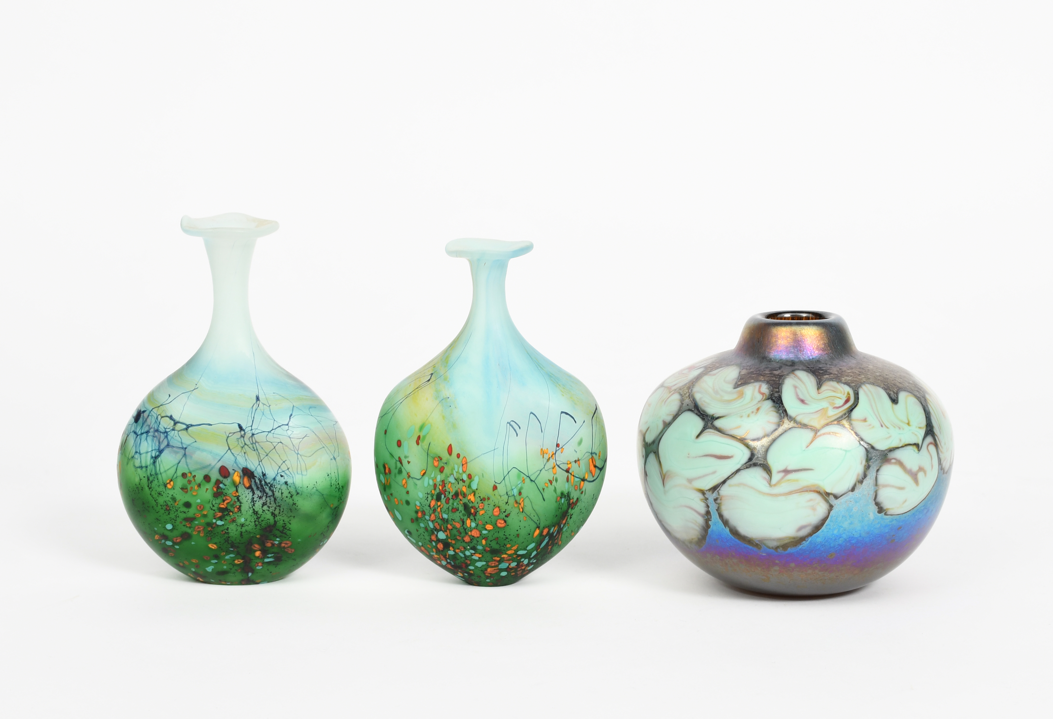 flattened opaque glass disc body with slender neck and everted, wavy top rim, surface decorated in colours, another similar and an ovoid vase with iridescent surface decoration,