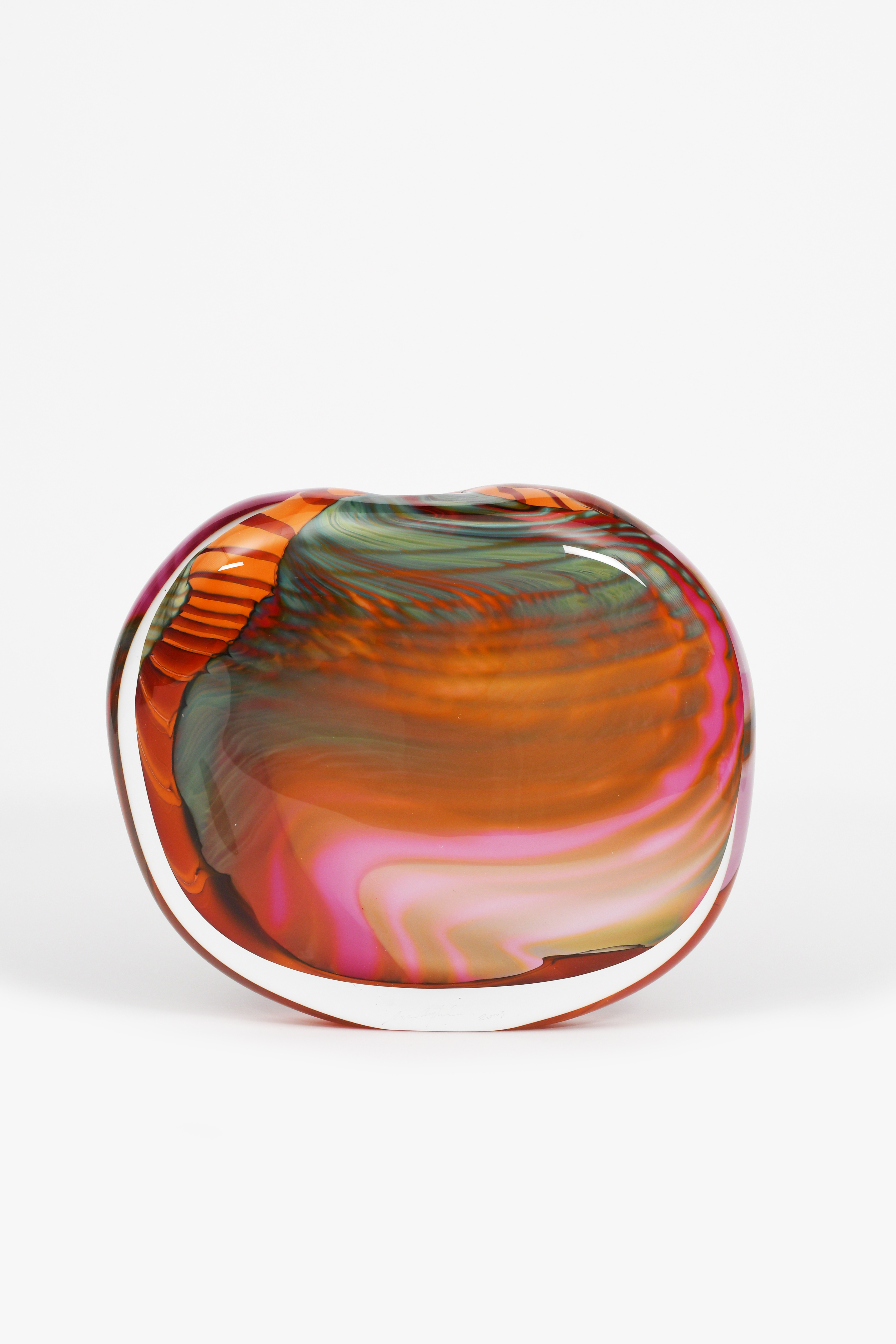 orange, red and pink glass cased in clear, flattened disc vase with elliptical aperture,