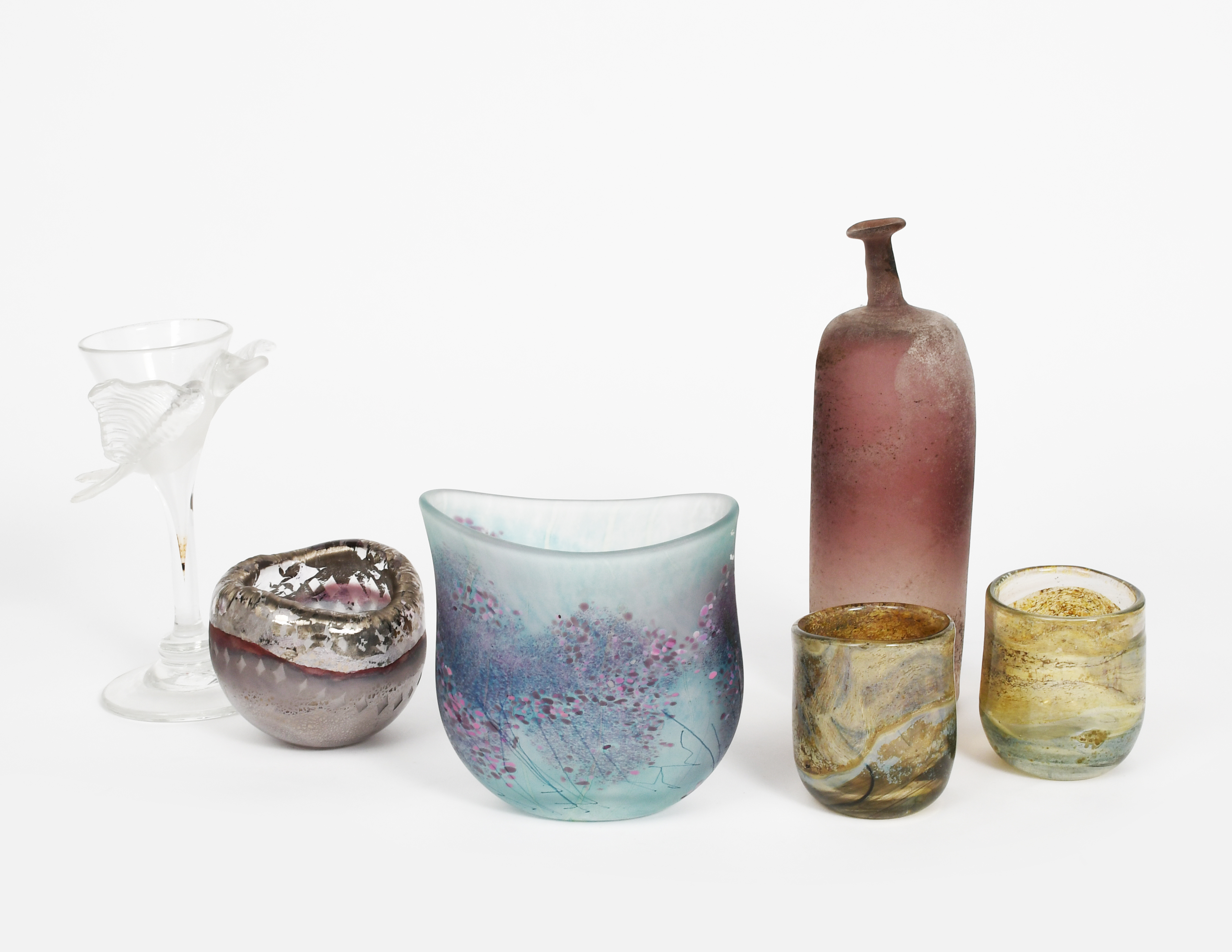 elliptical frosted pale blue glass, surface decorated with purple and pink flower stems, a Lloyd-Murray studio glass vase, a Hildegard Pax glass panel, and a collection of glass mainly modern