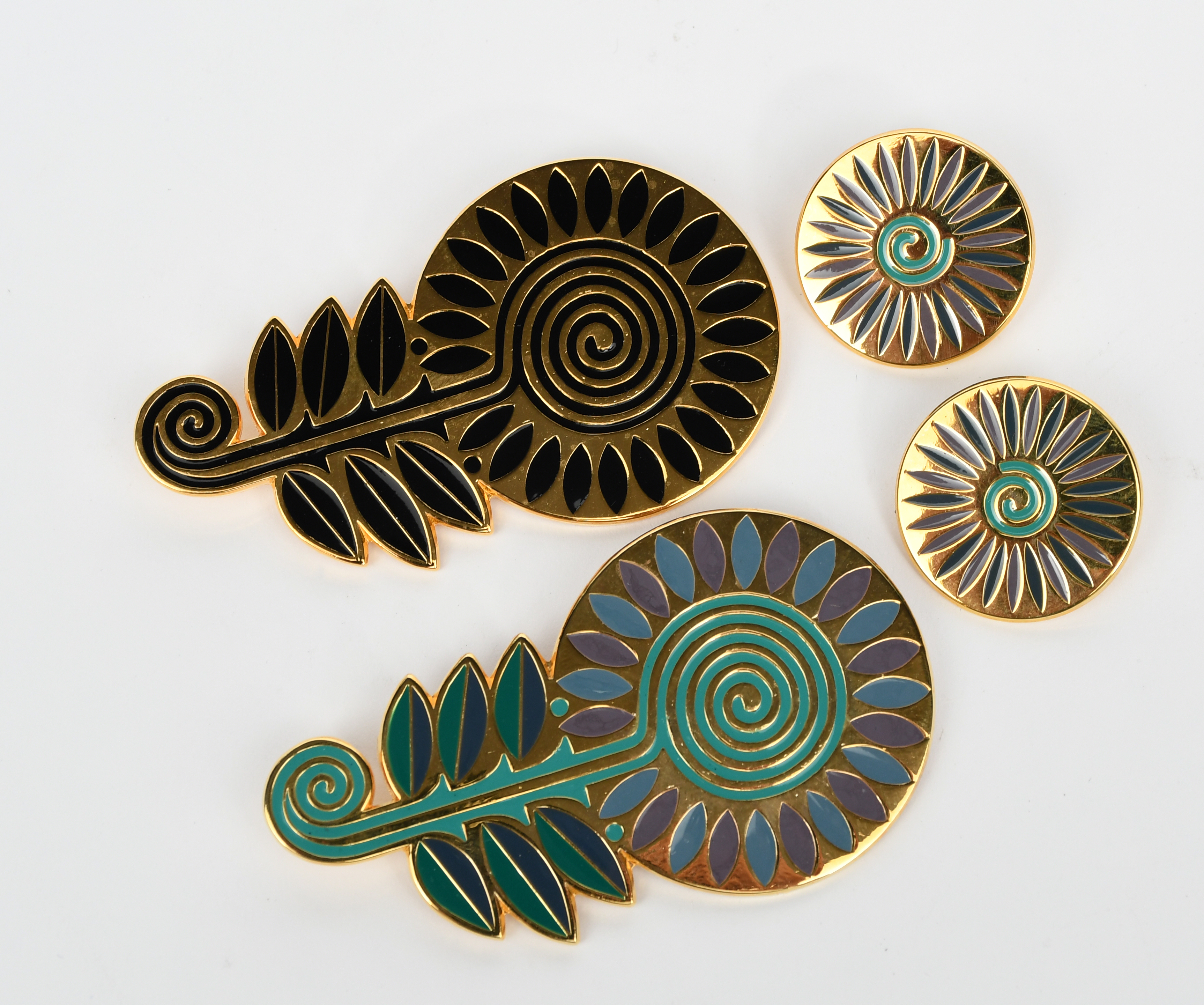 a polished brass and enamel sunflower brooch and earrings, enamelled in purple, blue and turquoise, and another brooch enamelled black,