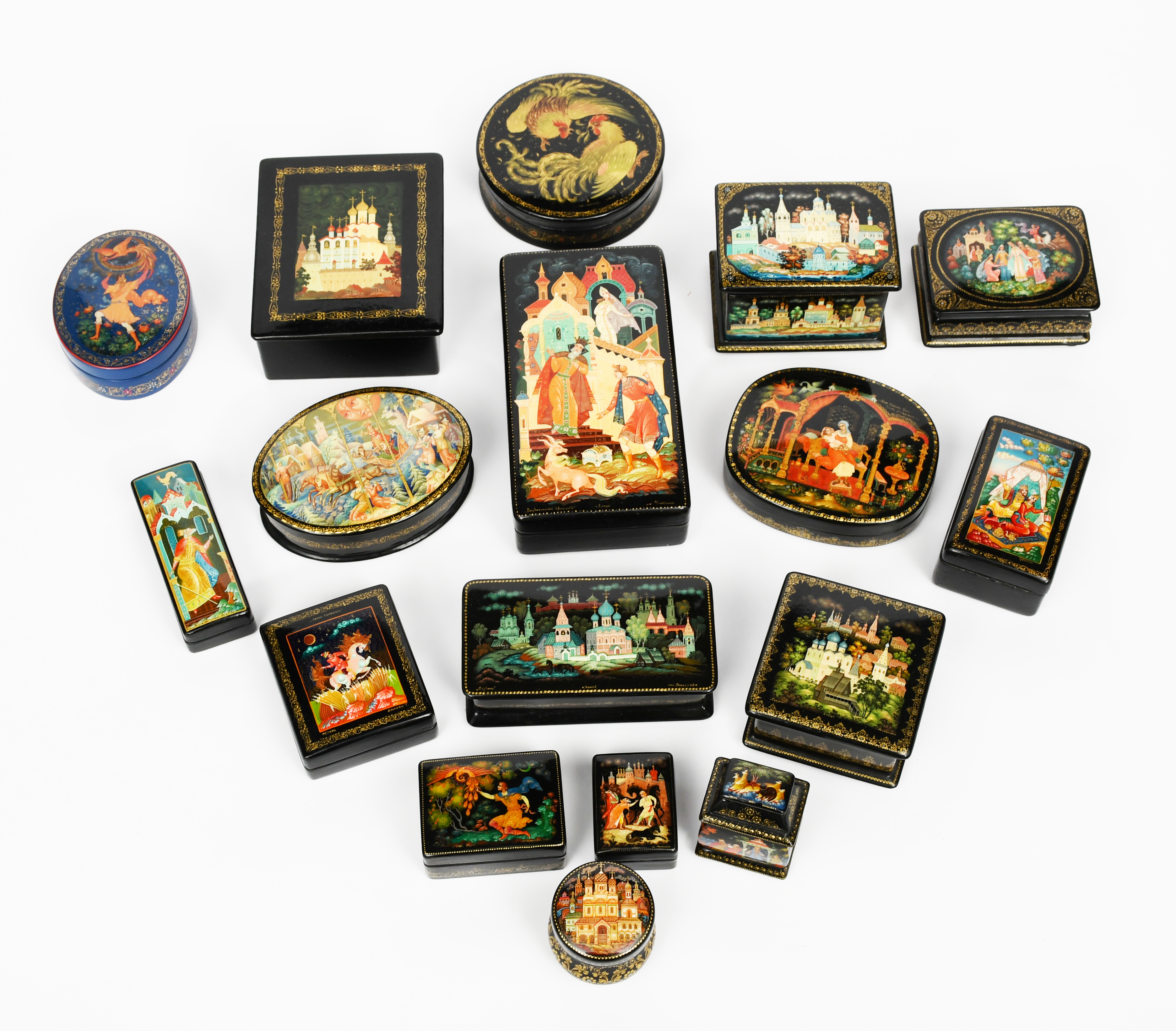 A collection of seventeen modern Russian lacquer boxes, including Winter Festival by Molodkin, and a brass cross, various marks and labels, (18)