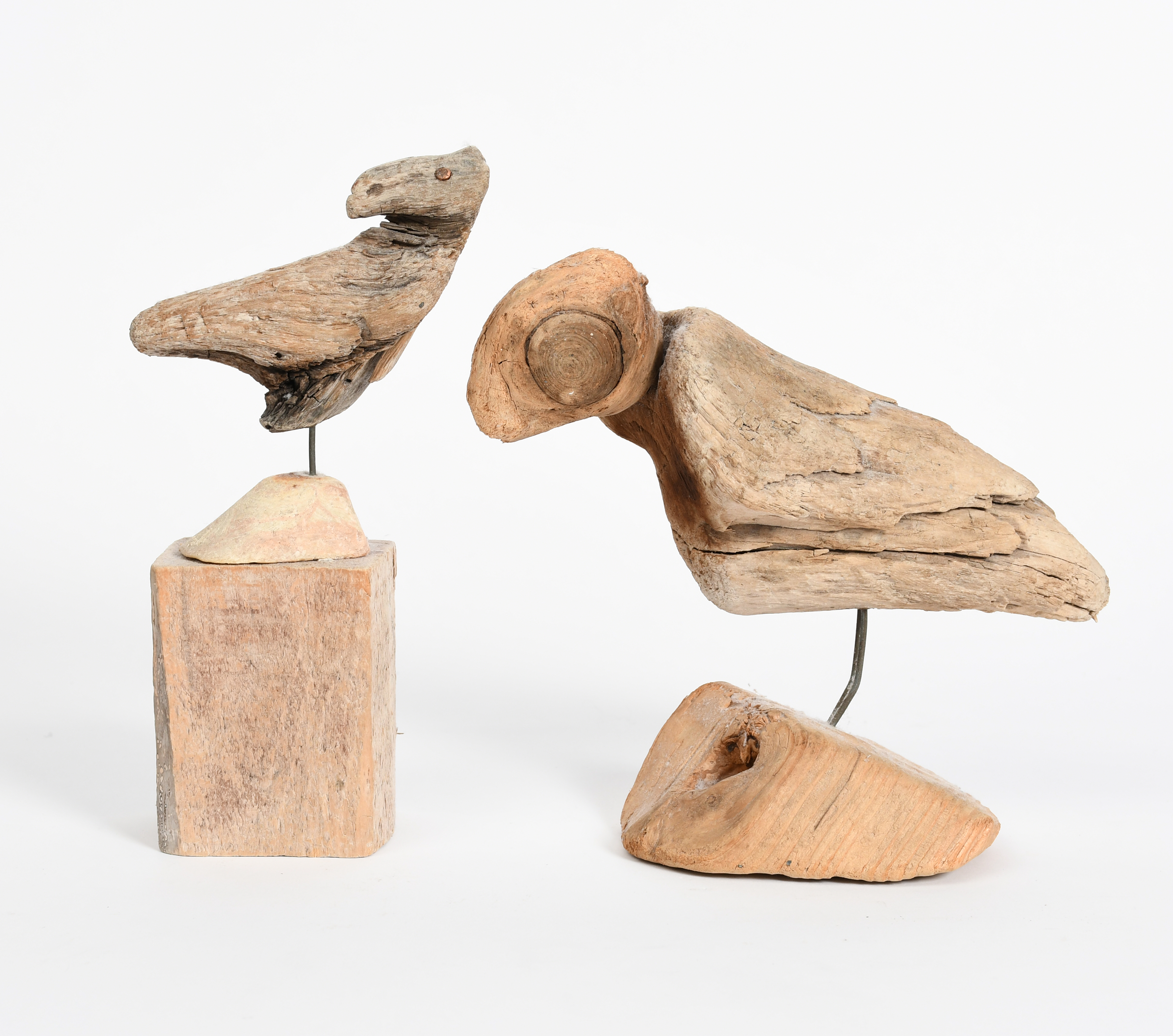 driftwood sculpture on wood plinth, and another driftwood bird sculpture by Sid Burnard, dated 2008
