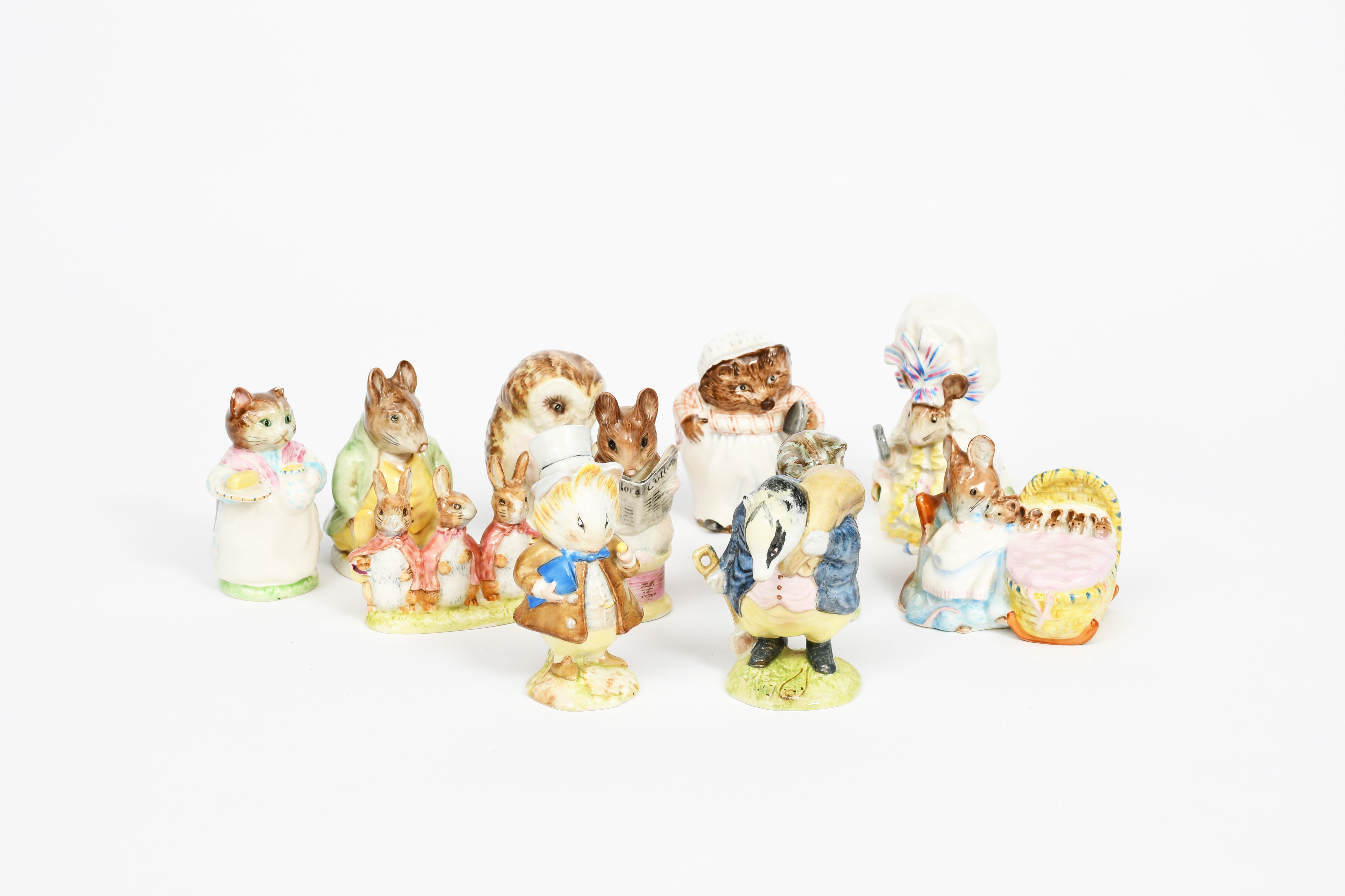 Tommy Brock (spade handle out) an early Beswick Beatrix Potter figure, 'Amiable Guinea Pig' , 'Old Mr Brown', 'Samuel Whiskers', 'Hunca Munca', 'Tailor of Gloucester', 'Miss Moppett', 'Flopsy, Mopsy & Cottontail', ''Lady Mouse', 'Mrs Tiggy Winkle', and 'Ribby' ten Beatrix Potter figures, main silver mark, ten figures various marks, Ribby ear chipped off, Miss Moppett ear chipped, 8.5cm. high (Tommy Brock), (11)
