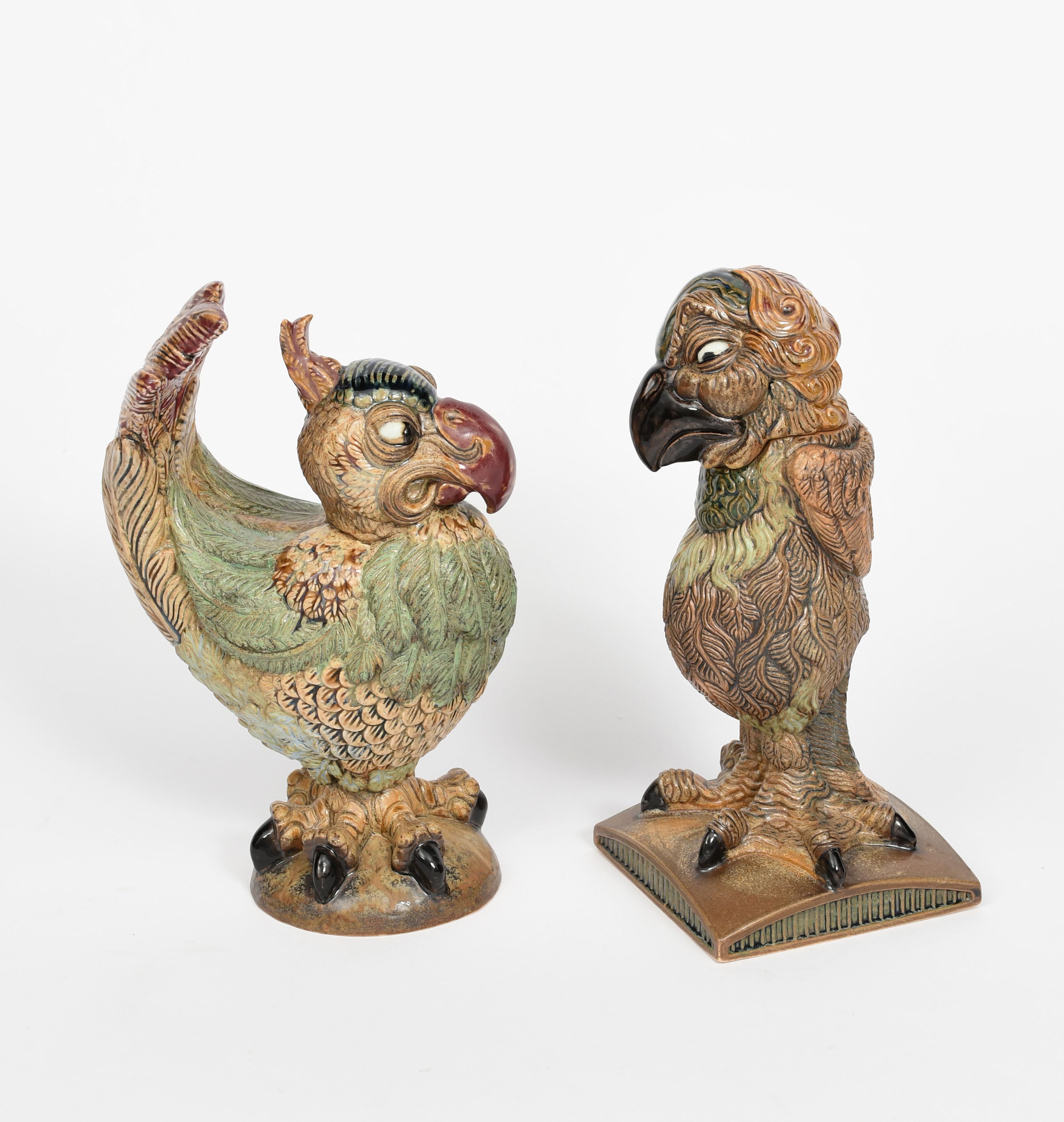 The Barrister a Burslem Pottery bird jar and cover by Andrew Hull, 26-29th May 2005, modelled standing with portly tummy, head bowed in thought, glazed in colours, and a bird by Andrew Hull, 2005, impressed and incised marks, 25cm. high (3)