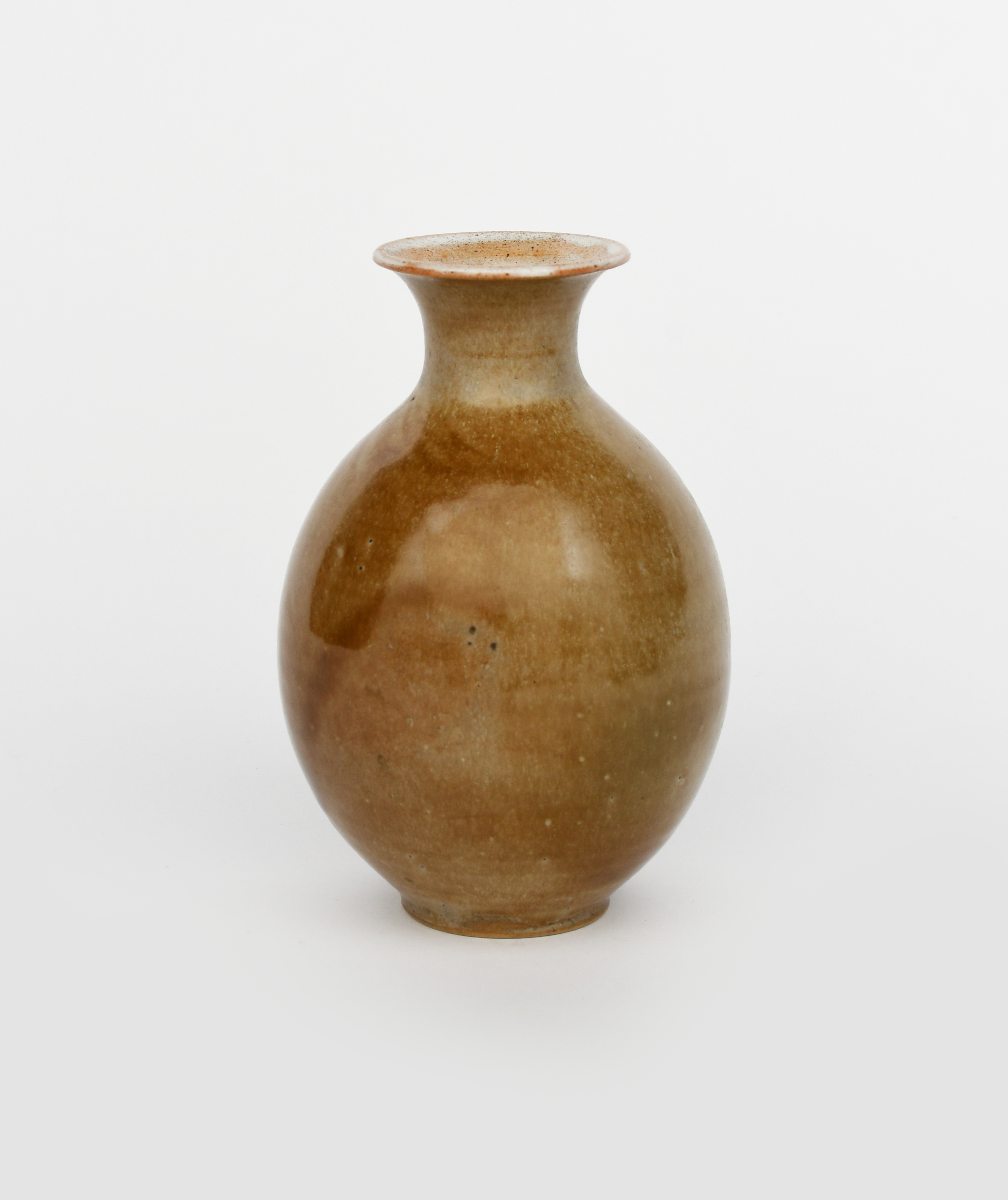 An earthenware vase by Otto Lindig, hand thrown ovoid form with everted rim, covered in a streaked silver-grey and tan glaze, incised marks for Otto Lindig and his son Markus Lindig, 17.5cm high