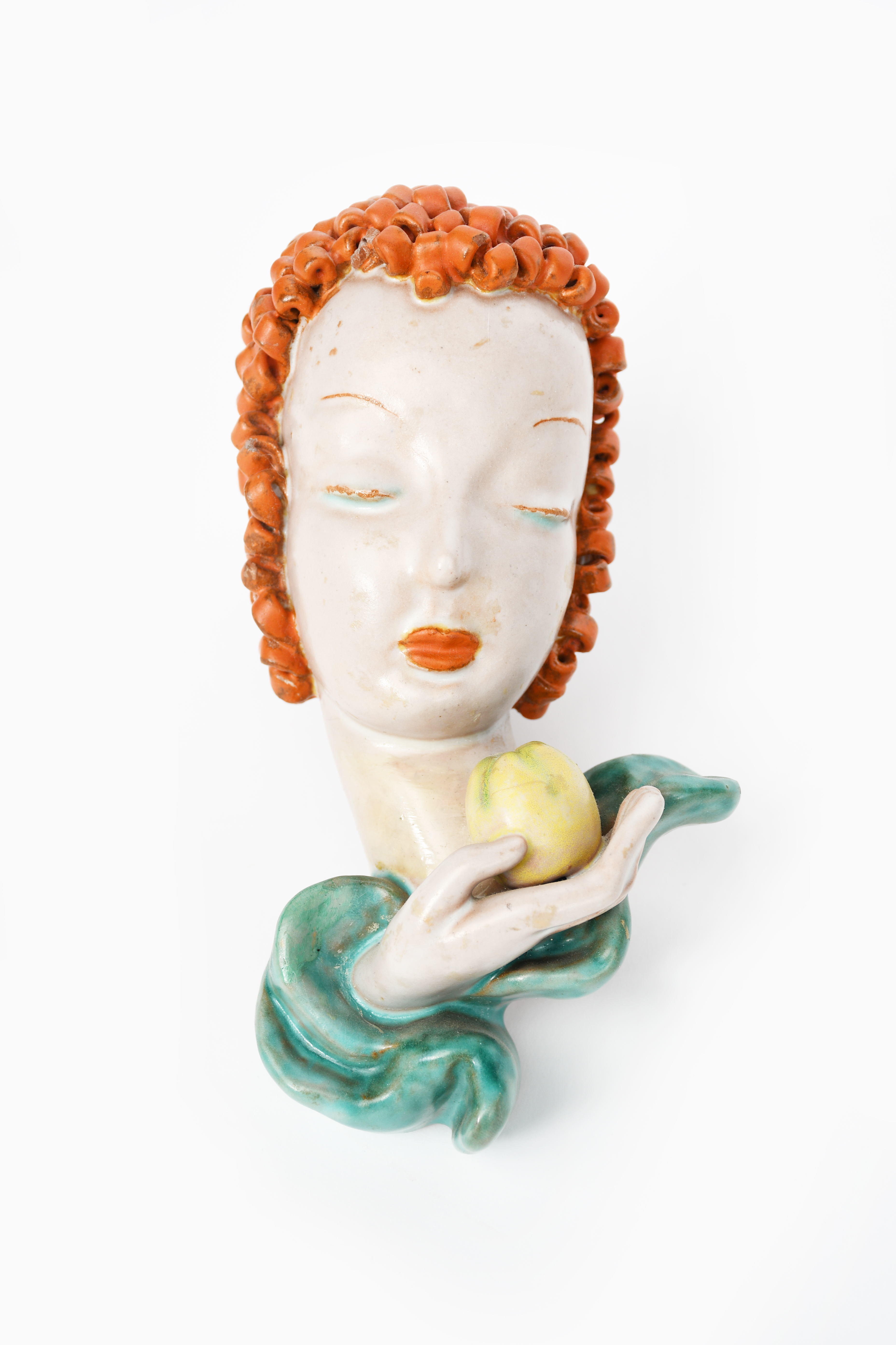 A Goldscheider Pottery wall mask, model no.6774, modelled as a woman with orange curly hair, holding an apple, glazed in colours impressed and printed marks, restored neck and losses to hair, 20.5cm. long