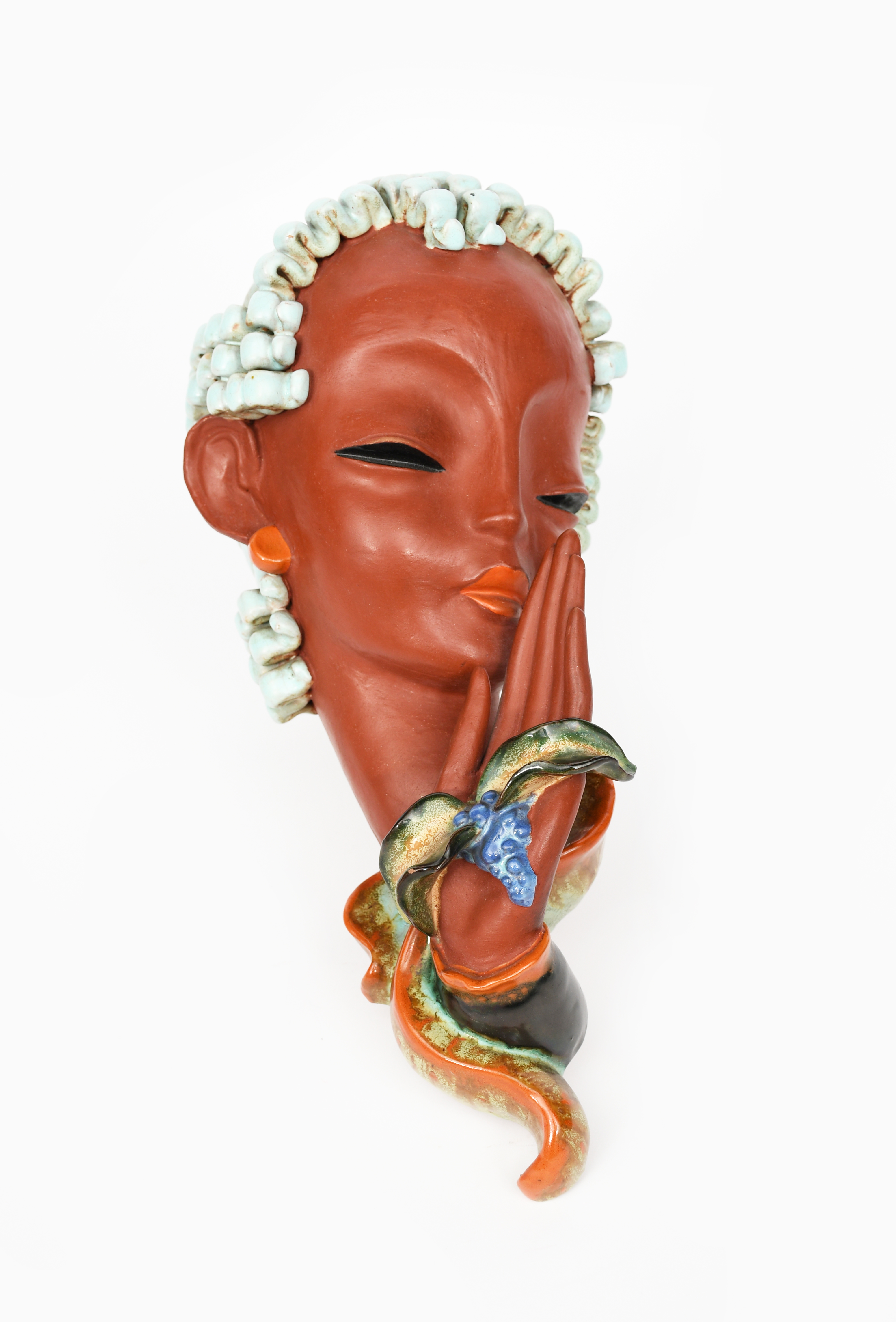 A large Goldscheider Pottery wall mask, model no. 7608, her hand raised up holding up a flower, with pale blue curly hair, in colours impressed marks, restored ear, small glaze nick to petal, 38cm. long