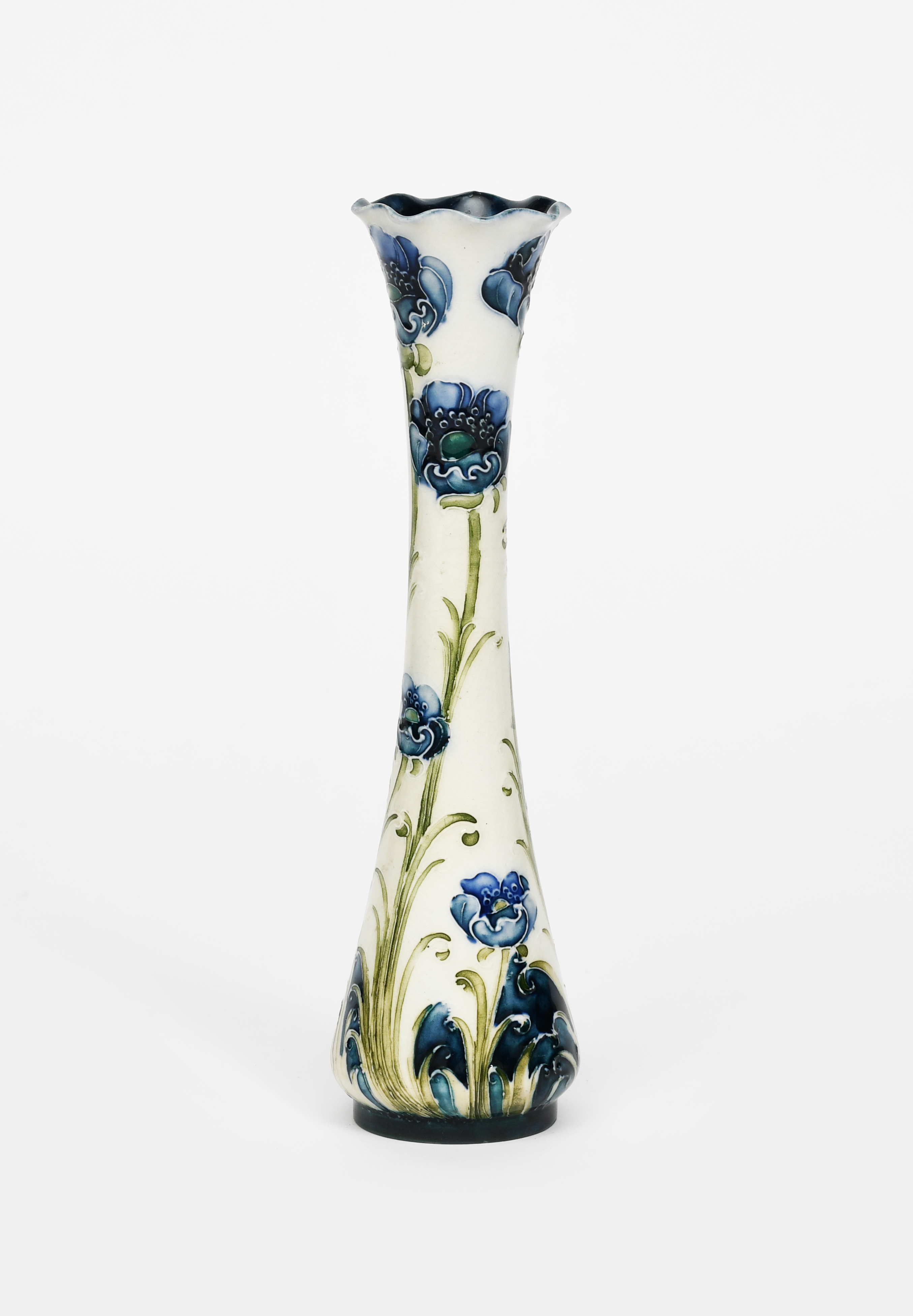 A James Macintyre & Co Florian Ware solifleur vase designed by William Moorcroft, waisted form with fluted rim, tubeline decorated with flower stems in blue and green on a white ground, printed factory marks, painted green signature, professionally restored top rim, 19.5cm. high