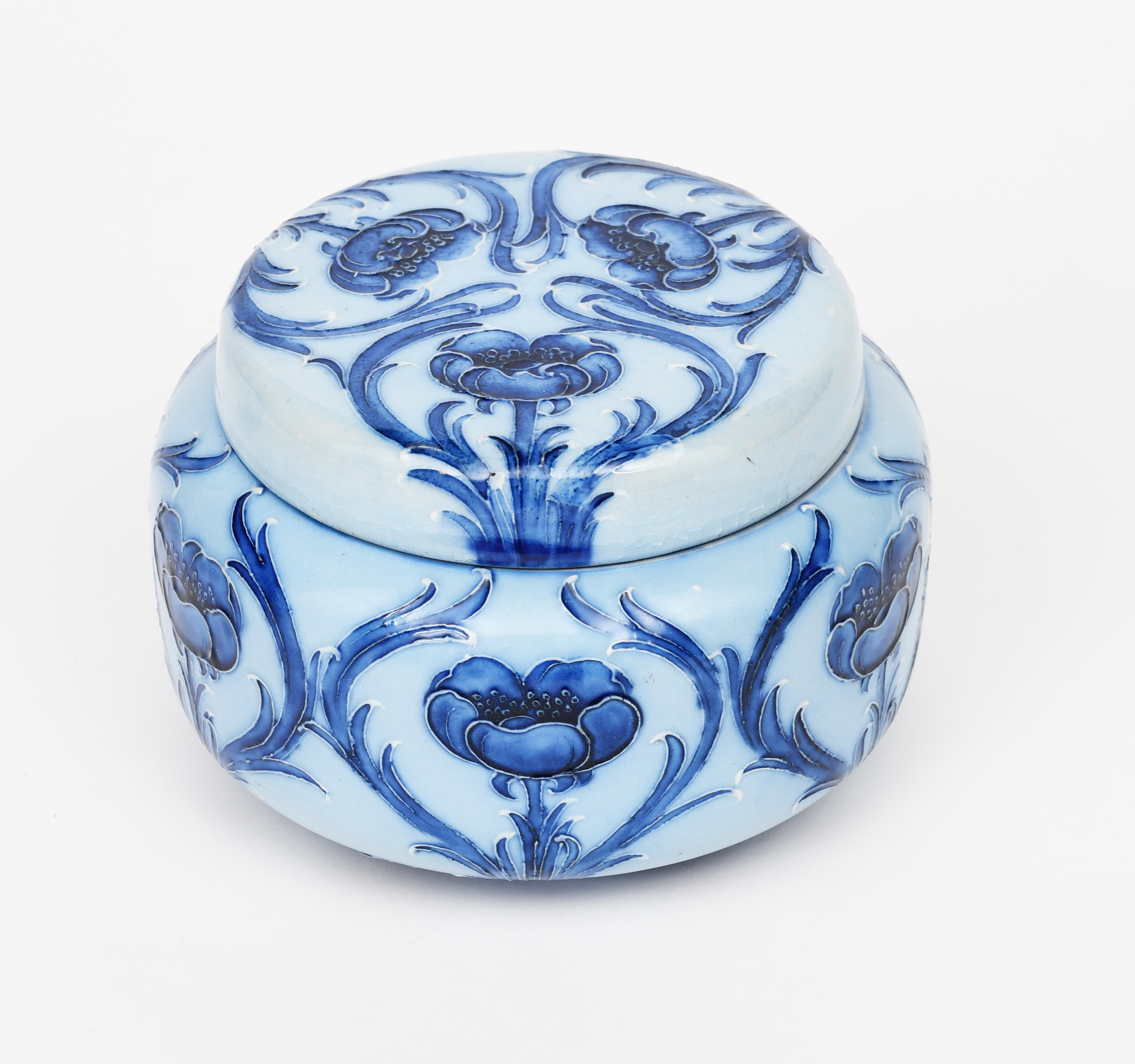 A James Macintyre & Co tobacco jar and cover designed by William Moorcroft, tubeline decorated with panels of anemone flowers in blue on a pale blue ground printed factory mark, painted green signature, professional restoration to pot threads, 15cm. wide. (2)