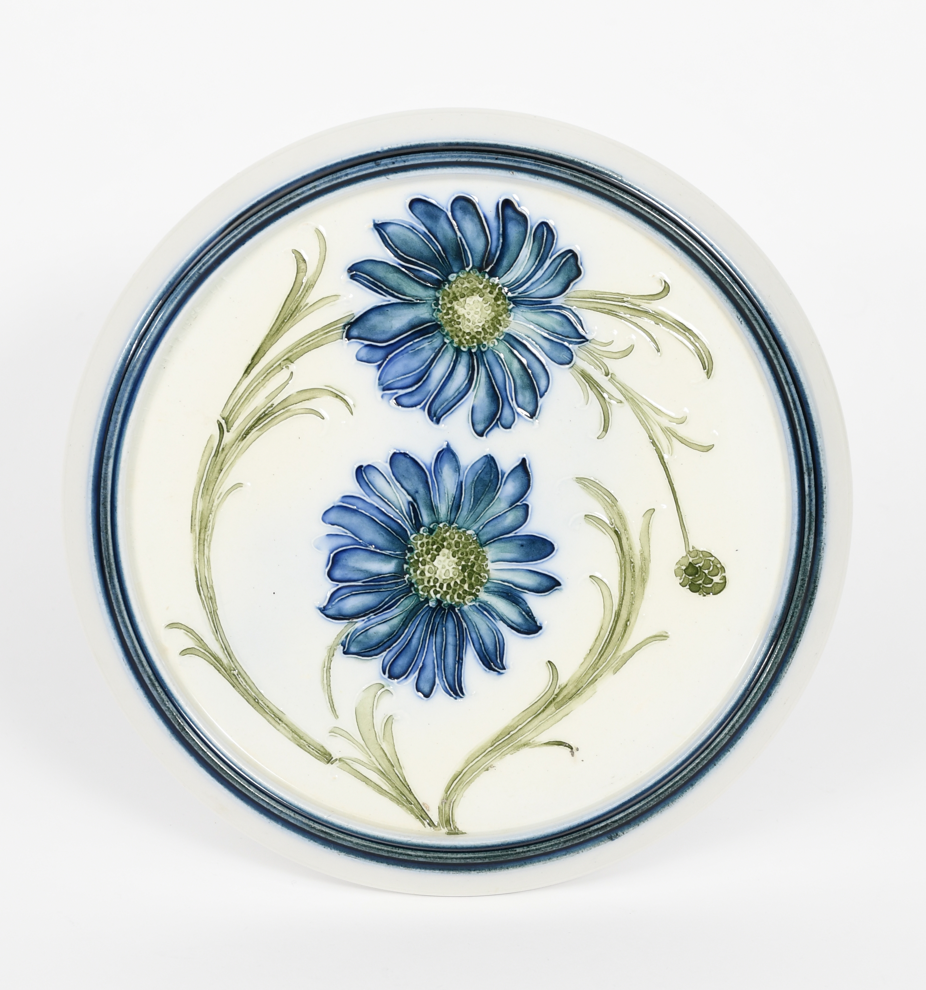 'Anemone' a James Macintyre & Co teapot stand designed by William Moorcroft, circular, tubeline decorated with two flowers in blue and green on a white ground, printed factory marks, 16.5cm. diam.
