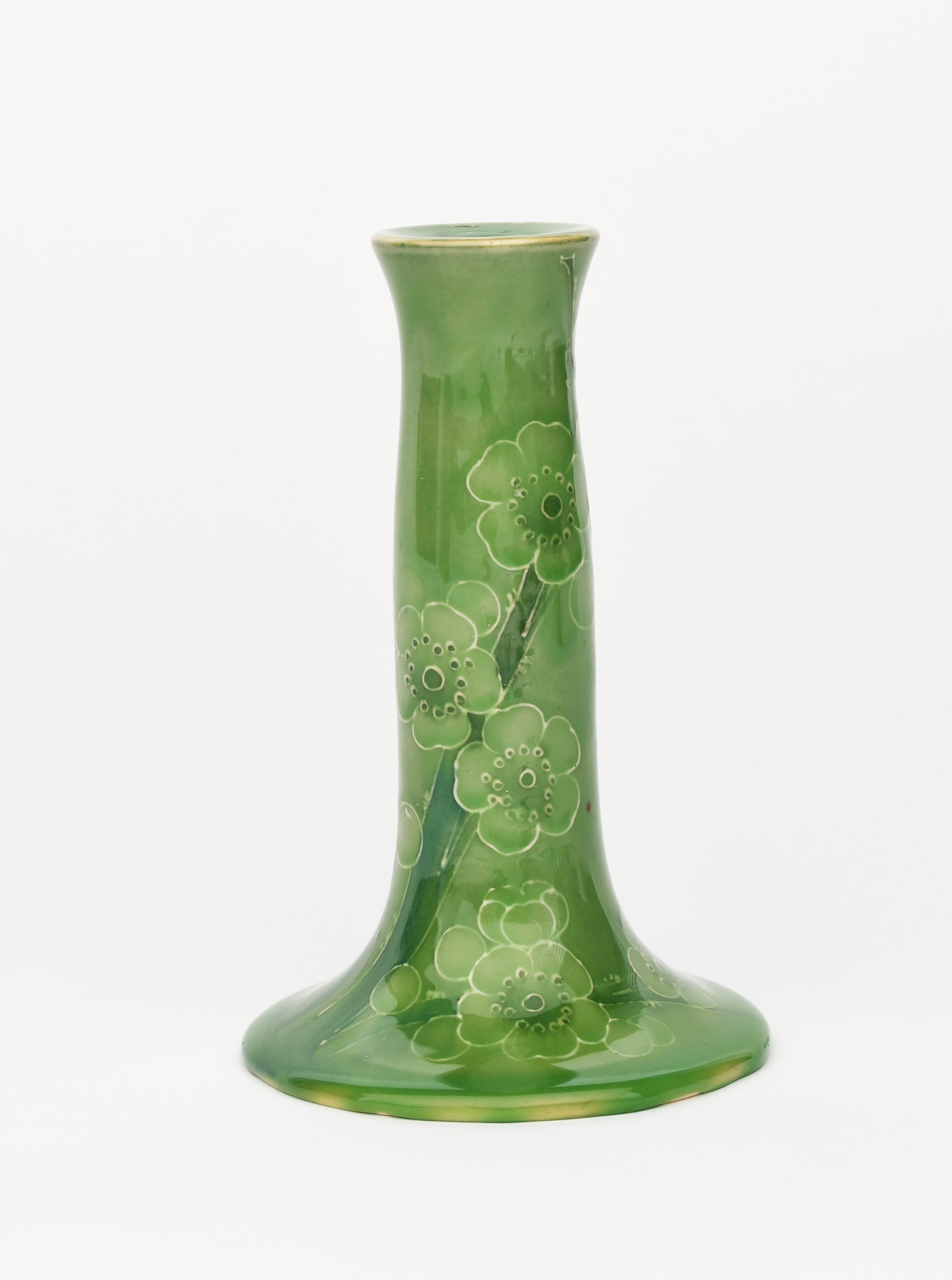 'Prunus' a Moorcroft Pottery candlestick designed by William Moorcroft, tubeline decorated on a pale green ground, painted facsimile signature, 15.5cm. high