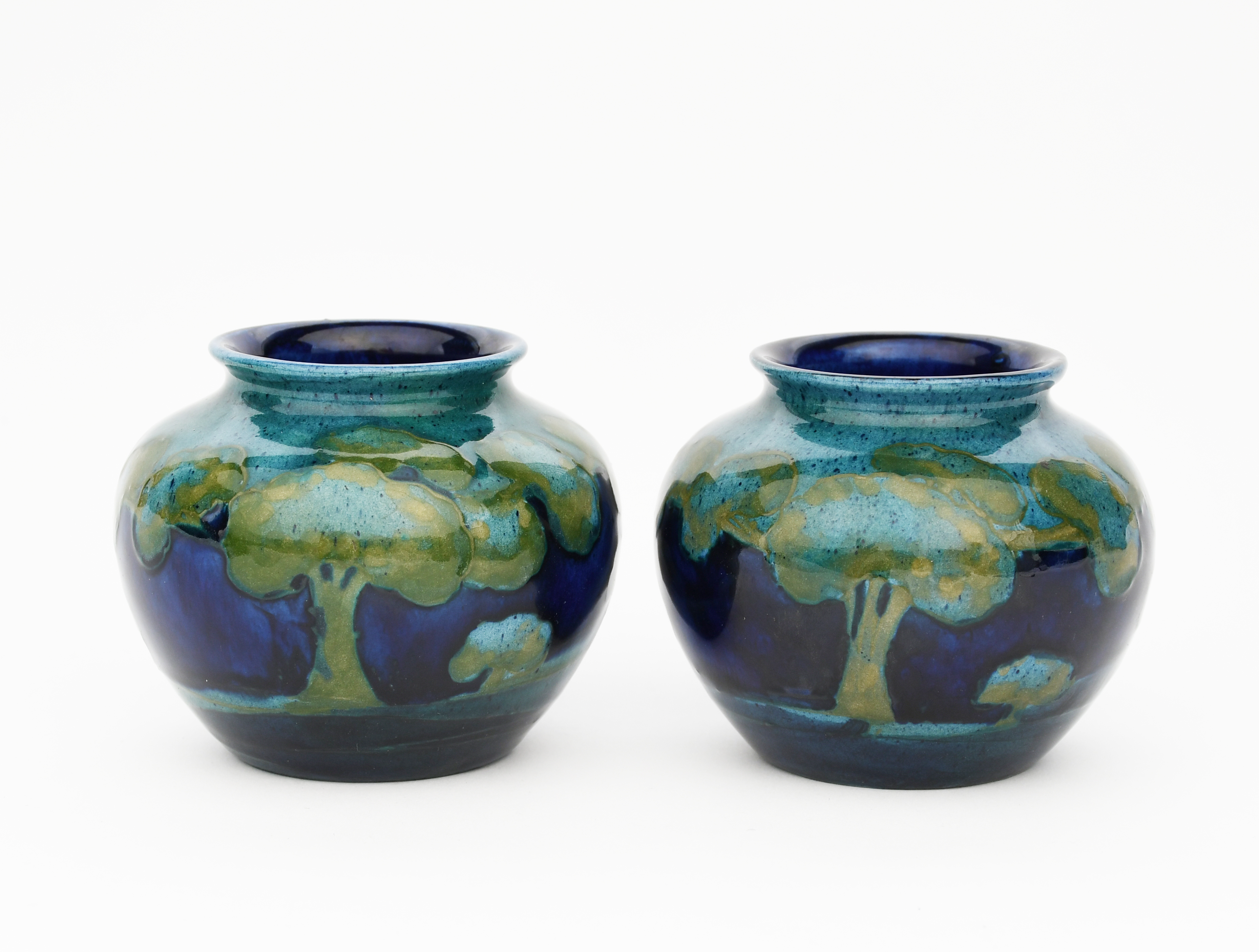 'Moonlit Blue' a pair of Moorcroft Pottery vases designed by William Moorcroft, ovoid with collar rims, painted in shades of blue and green on a deep blue ground, impressed factory marks, 7cm. high, (2)