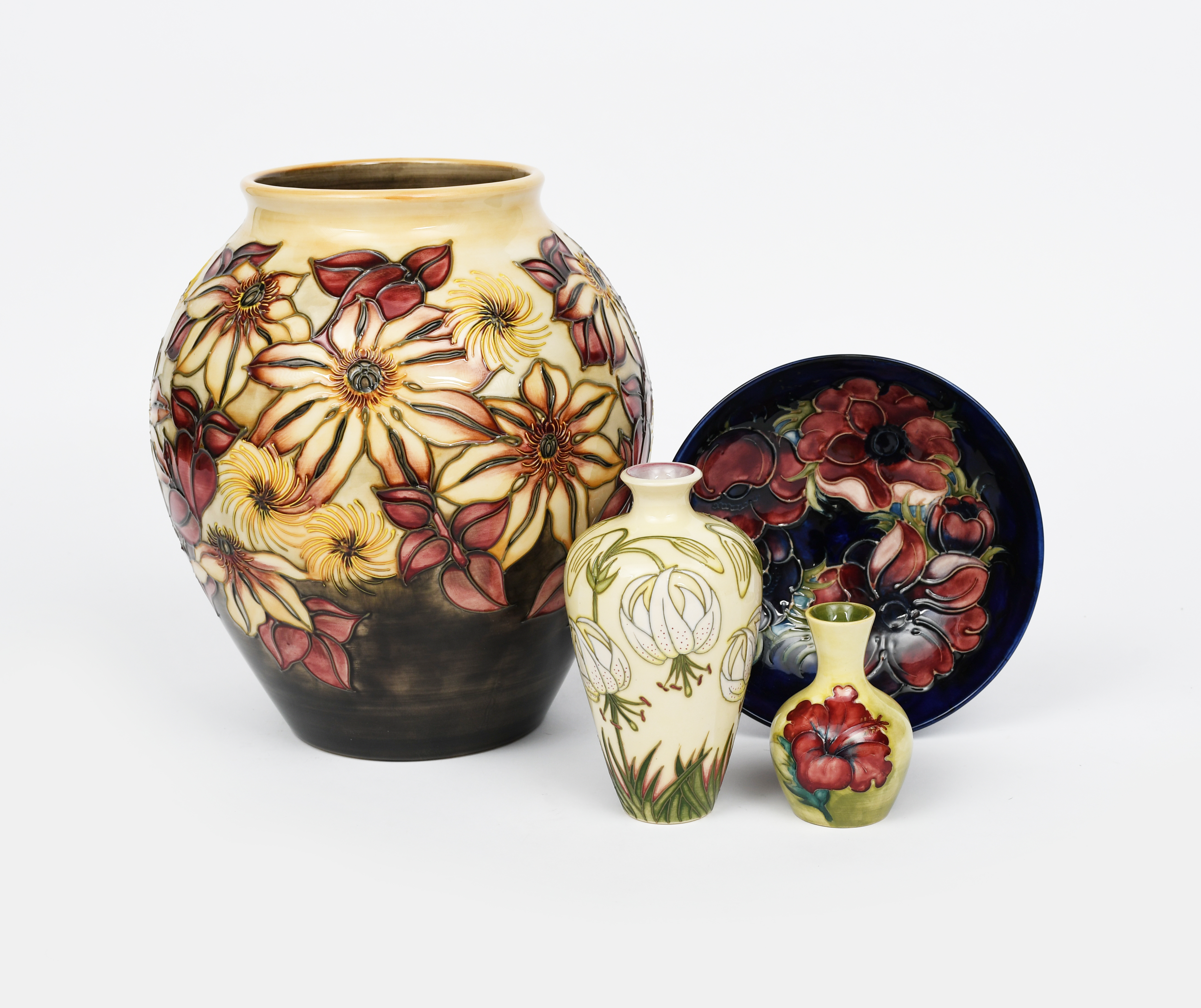 A modern Moorcroft Pottery vase, dated 2000, large ovoid form tubeline decorated in colours on a cream ground, another modern Moorcroft Pottery 'Golden Lily' vase, a Moorcroft Pottery 'Hibiscus' solifleur vase and an 'Anemone' bowl designed by Walter Moorcroft impressed and painted factory marks, 27cm. high, (main vase) (4)