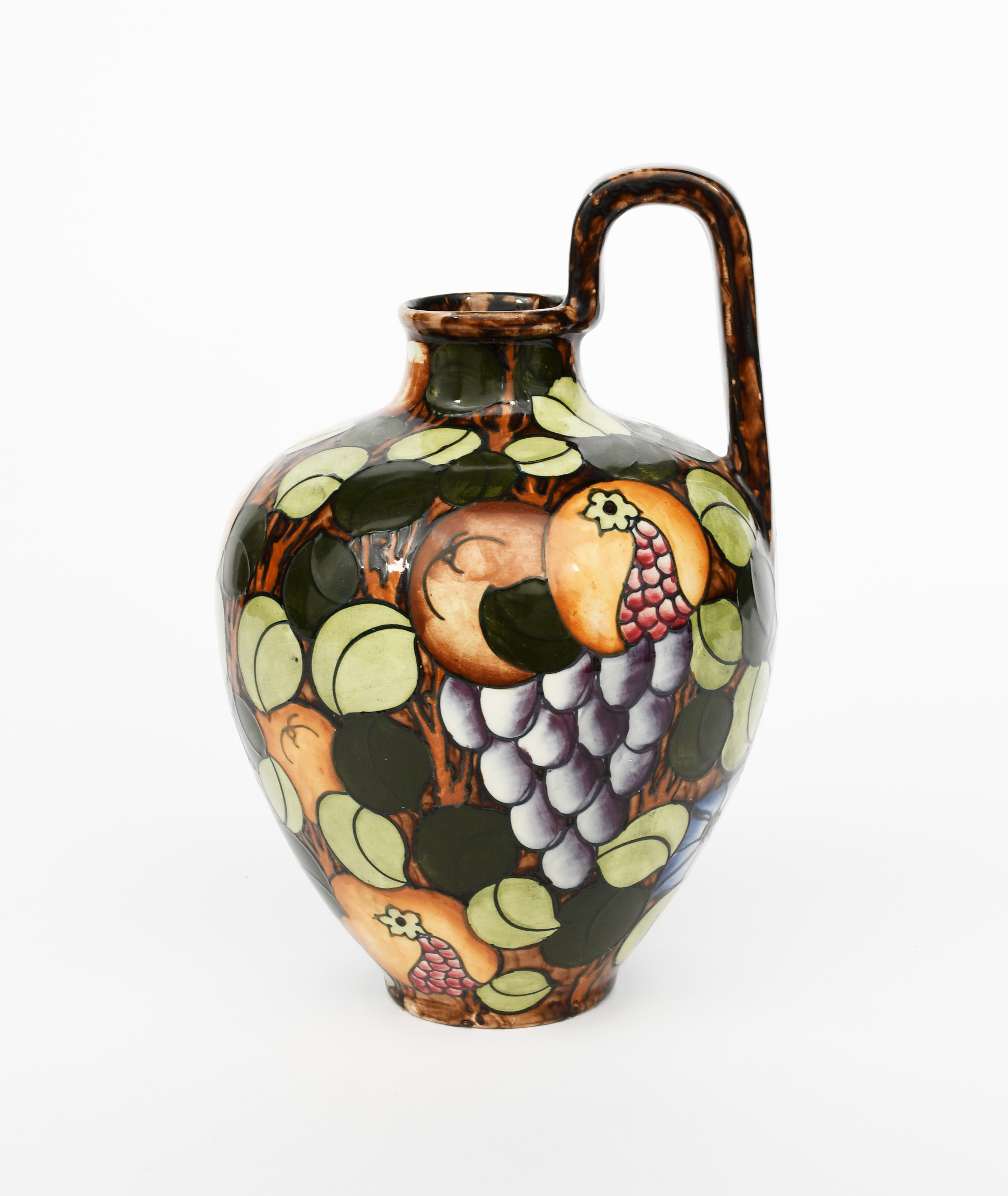 An early Bursley Ware Pomona vase designed by Charlotte Rhead, pattern no.456, shouldered form with loop handle, tubeline decorated in colours on a brown ground, printed factory mark, painted number, 27cm. high