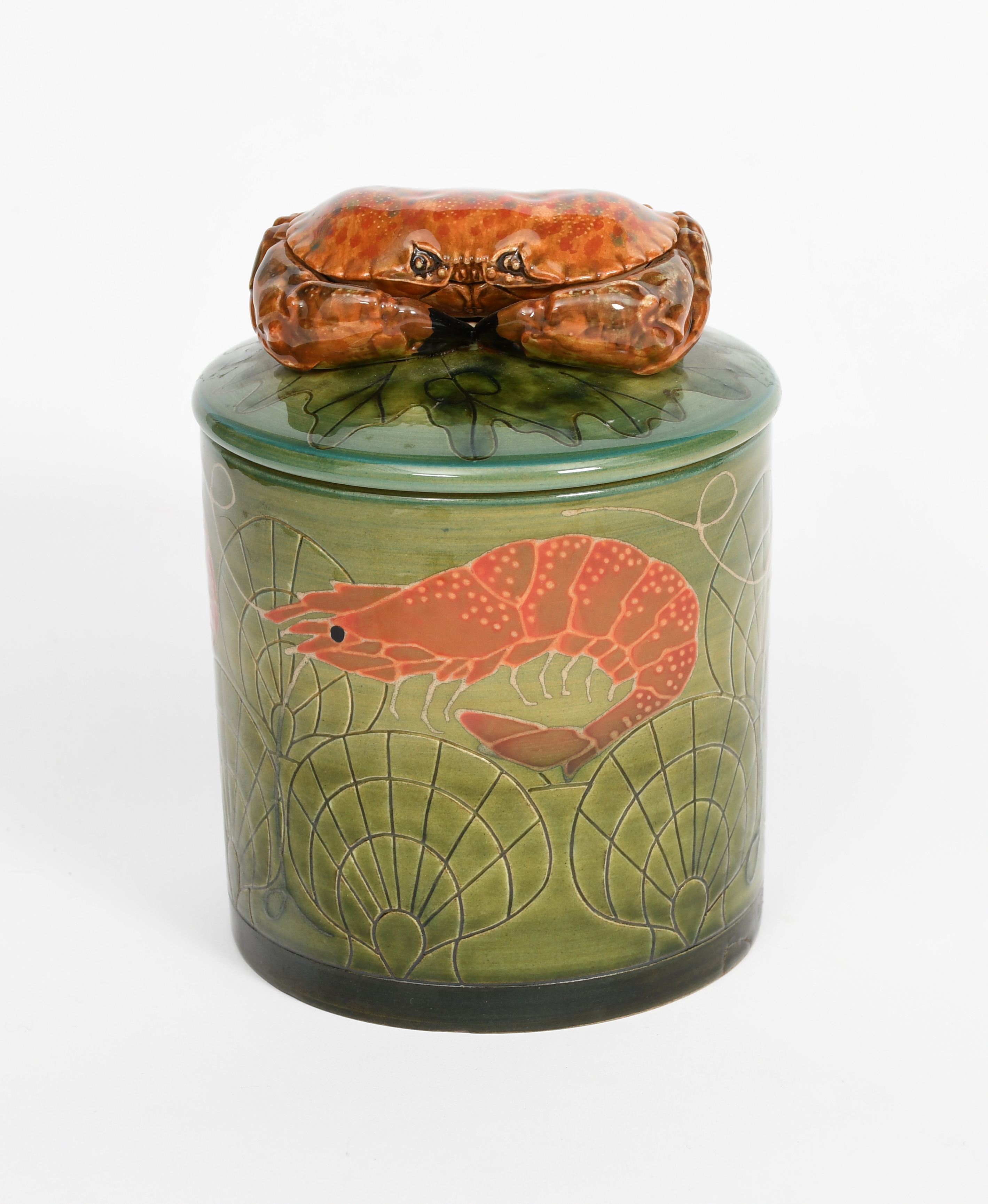 'Crab' a Dennis China Works large pot and cover designed by Sally Tuffin, dated 2003, cylindrical form incised with prawns and scallop shells, the cover modelled with a large crab finial modelled by Alan Pepper, impressed and painted marks, 15cm. high (2)