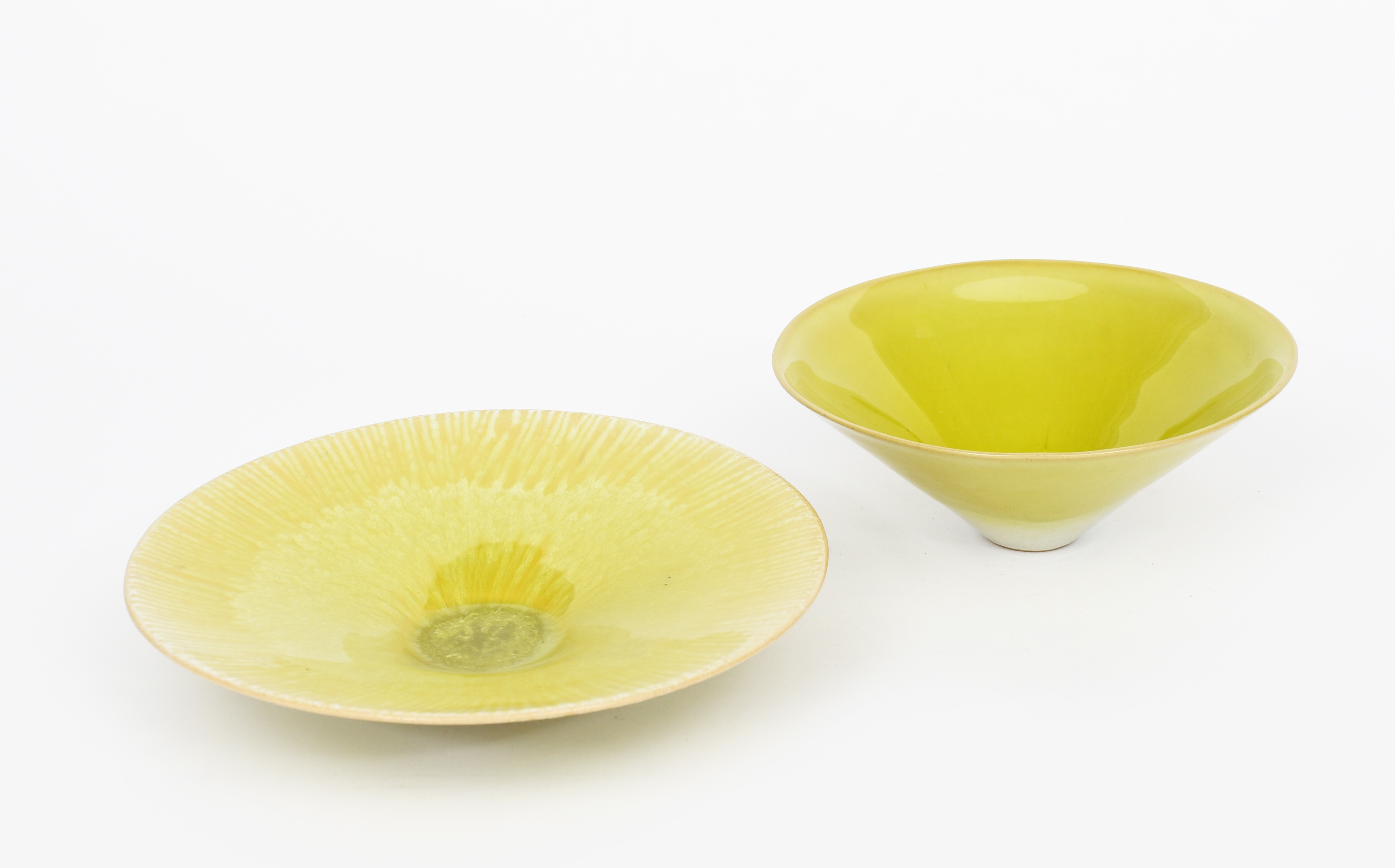 a stoneware footed bowl, painted with a lime green glaze, streaked at the rim, and a conical bowl by Estella Campavias, and ten Aldermaston Pottery goblets by Alan Caiger-Smith,
