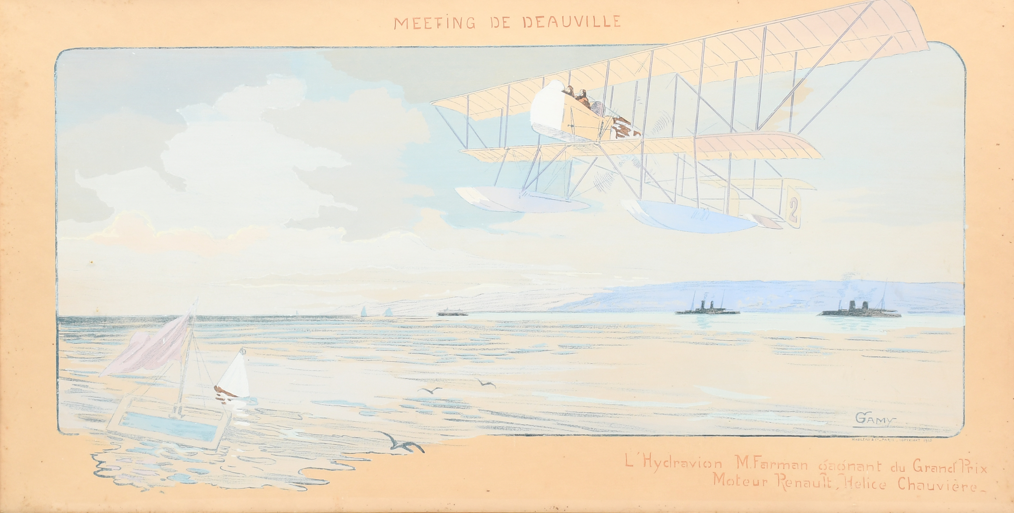 lithograph on paper, framed, printed by Mabileau & Co, Paris, and nine other lithographs by Gamy featuring planes and aeronautical scenes,