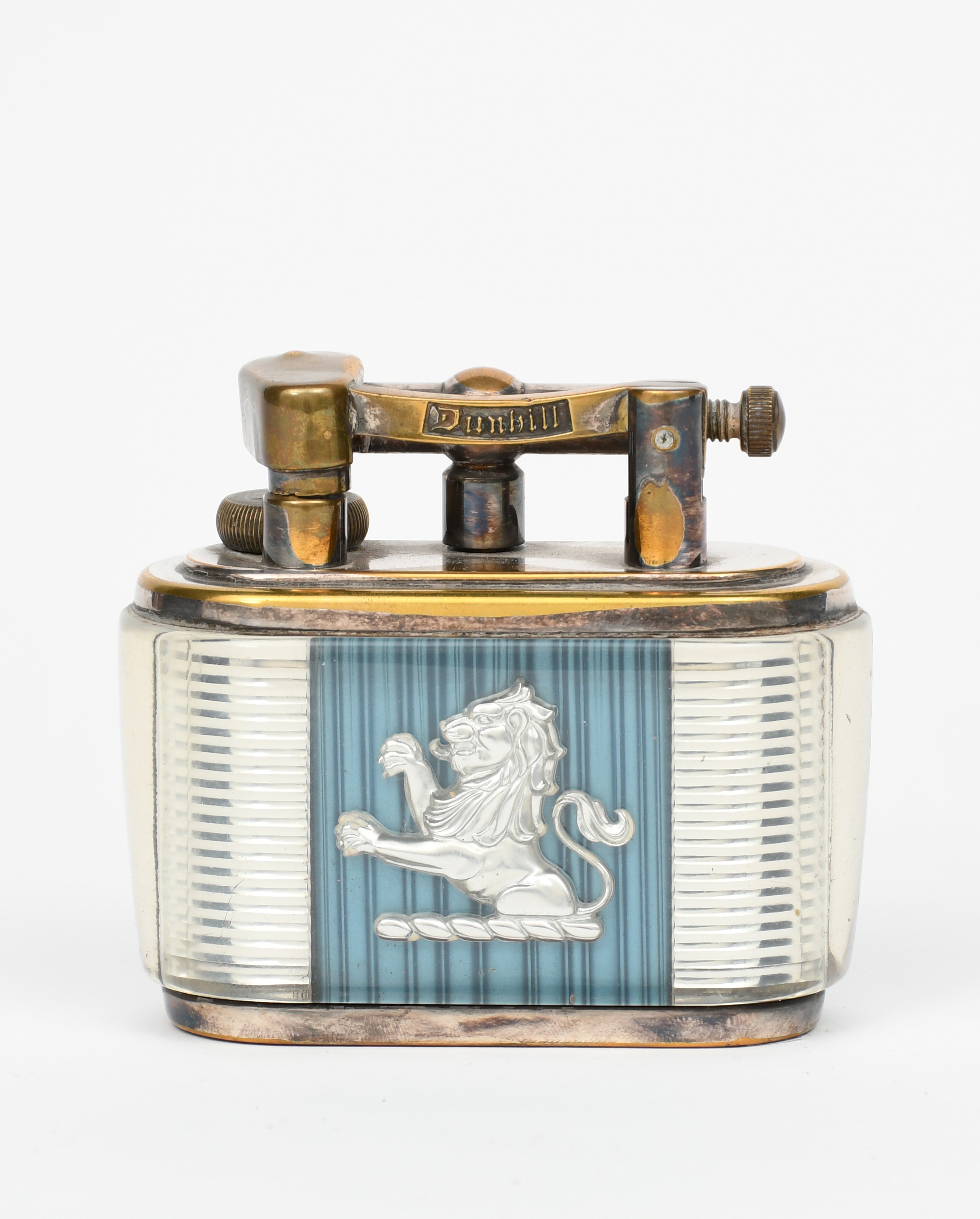 A Dunhill Joseph Lucas advertising table lighter, the perspex panels decorated with lion rampant in silver on a ribbed blue ground, cast mark Dunhill, base cast marks Plastics and Styling by Joseph Lucas Ltd Birmingham England 10cm. wide