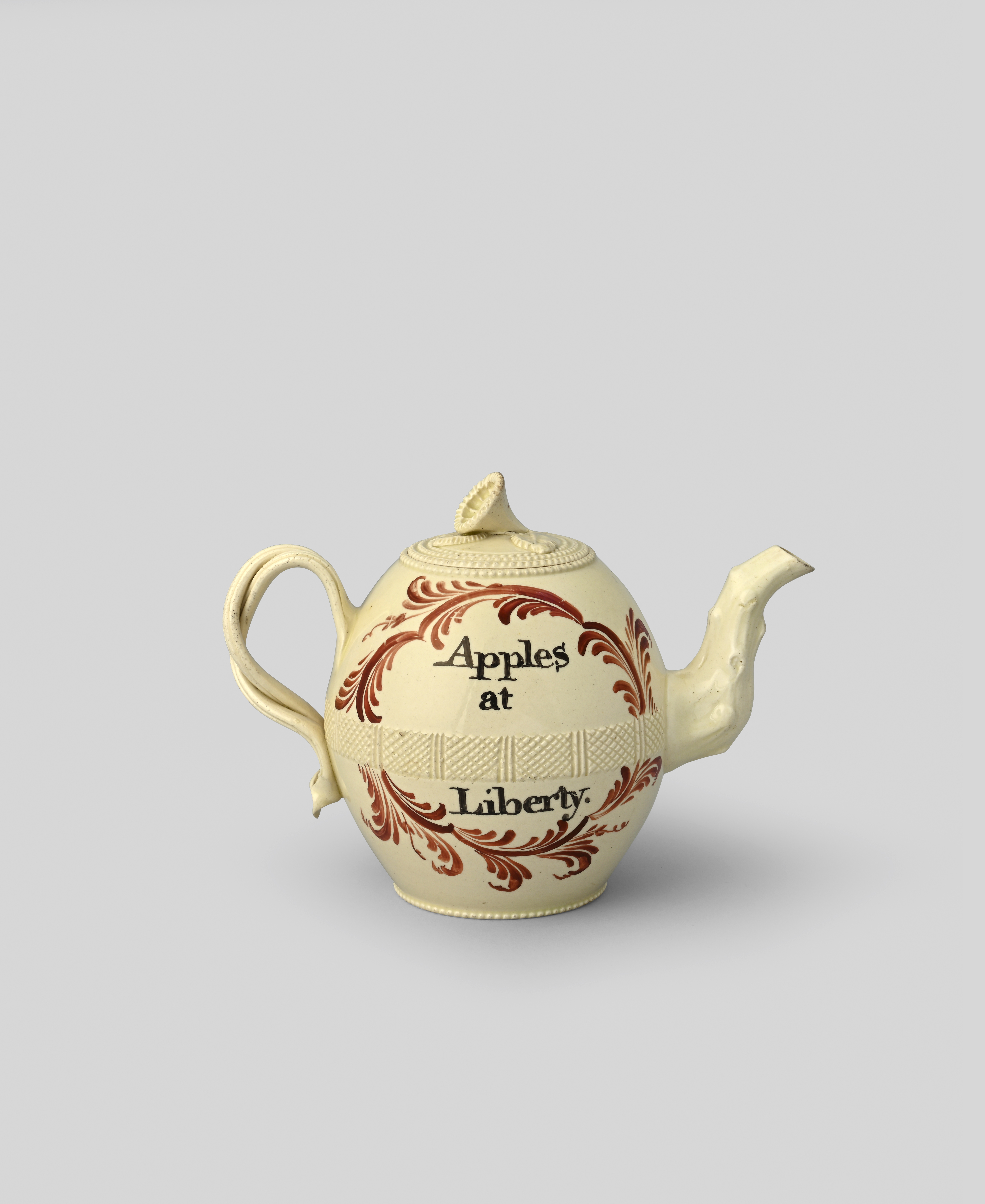 A creamware teapot and cover, c.1763-66, the ovoid body painted in black with the inscription 'No Cyder Act', the reverse with 'Apples at Liberty' within red scrolling cartouches, incised with a trellis band, set with crabstock spout and double strap handle, the cover with a floral knop, 16.6cm across. (2)