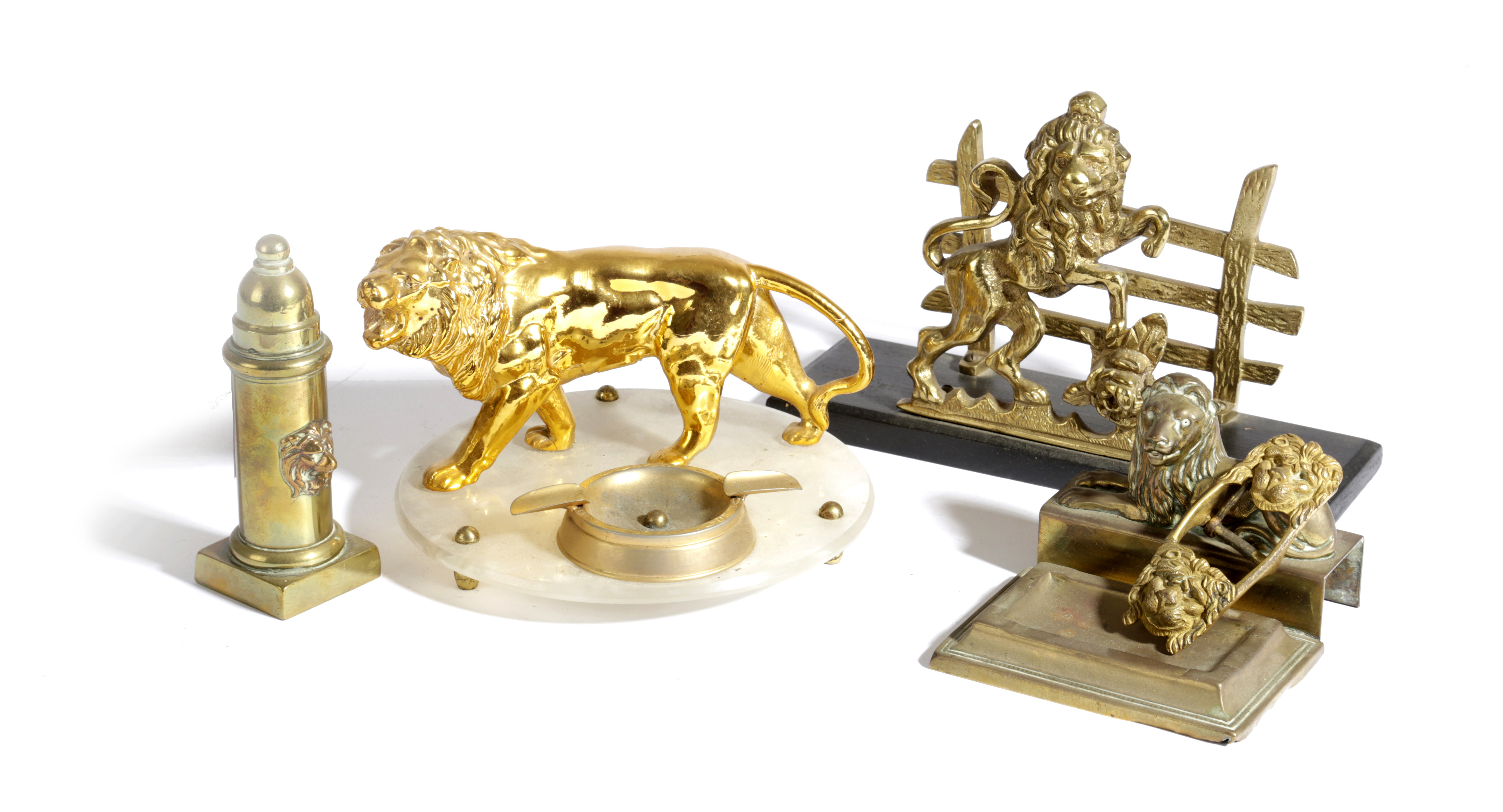 comprising: a brass and ebonised wood letter rack, a gilt brass buckle, a brass desk lighter in the form of a water hydrant and two desk stands (5)