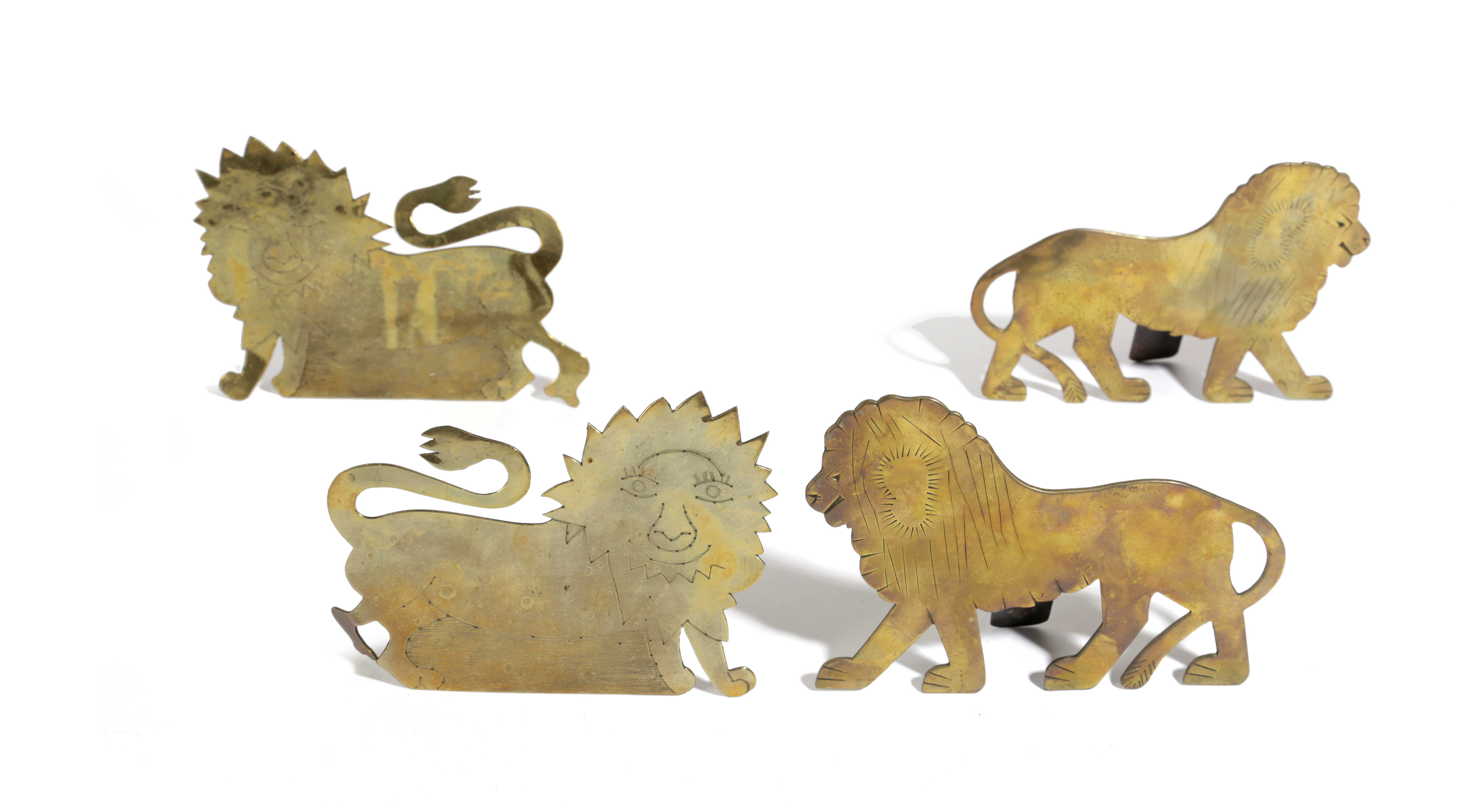 TWO PAIRS OF FOLK ART BRASS CHIMNEY LION ORNAMENTS