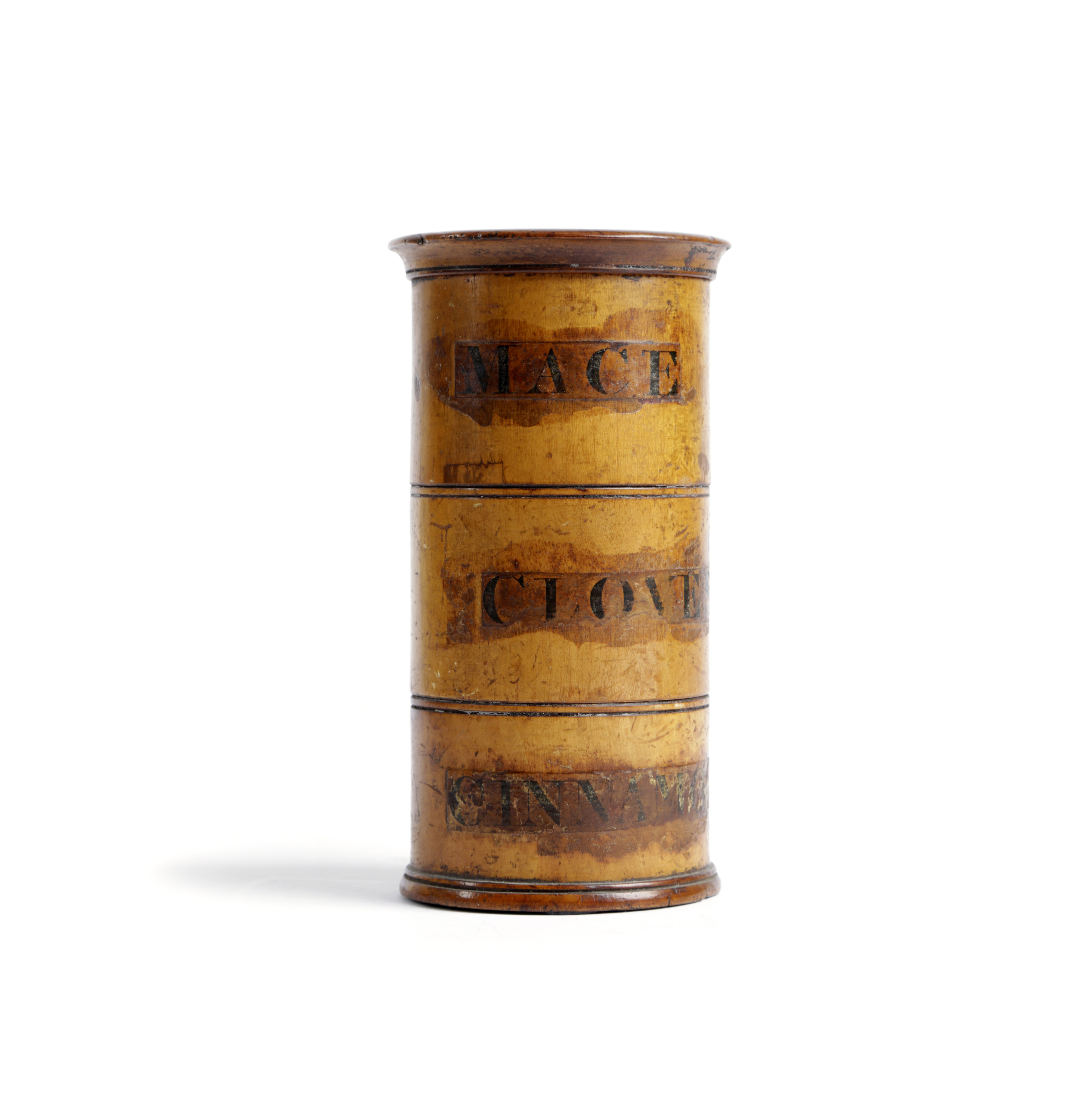 the screw-off lid above three divisions, each with a label 'Mace', 'Cloves' and 'Cinnamon'