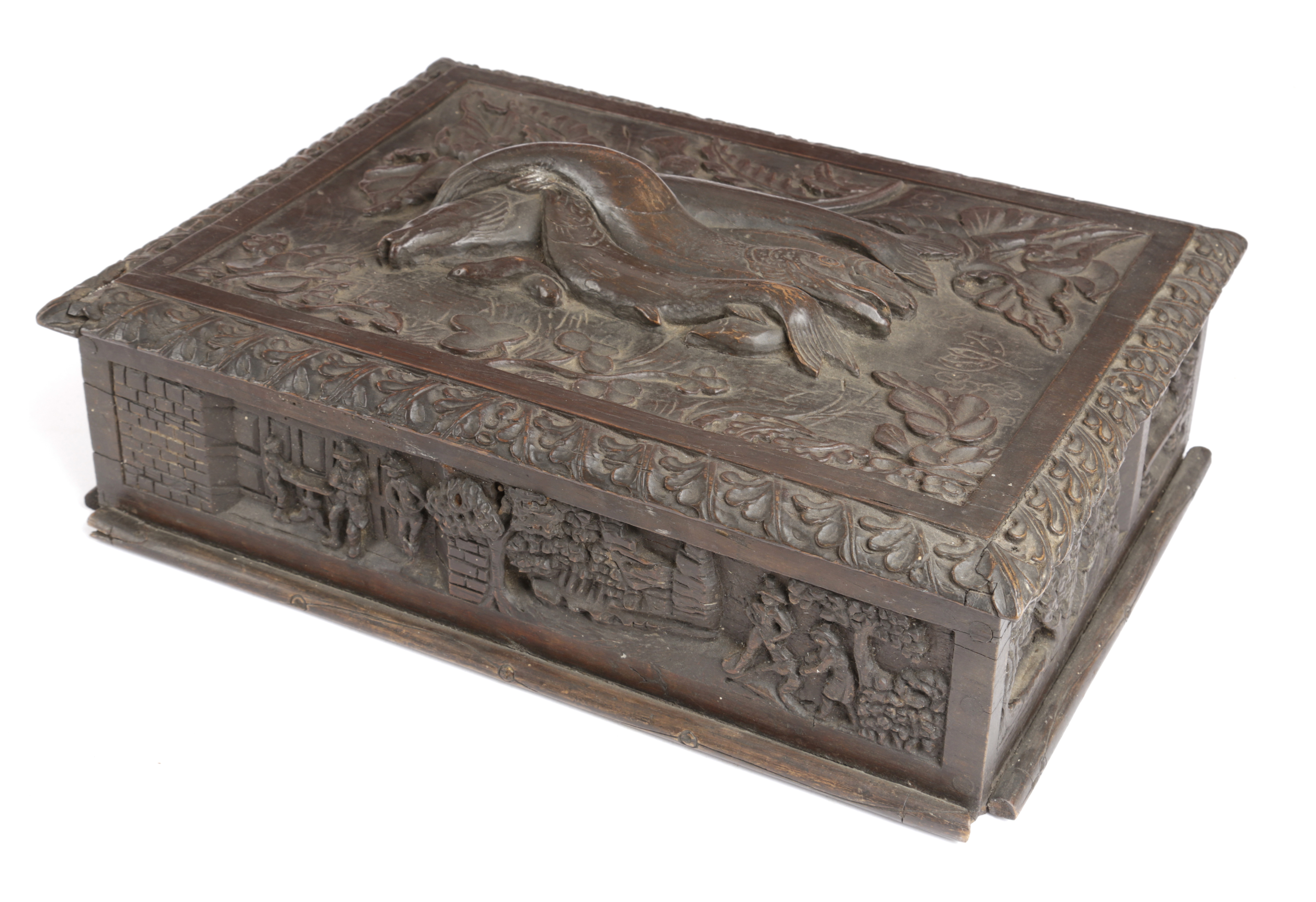 the hinged lid carved with various fish and leaves, with an oak leaf edge, the front and sides relief decorated with figures in various pursuits and two portraits, one of Izaac Walton, titled, the vacant interior originally with a lift-out tray