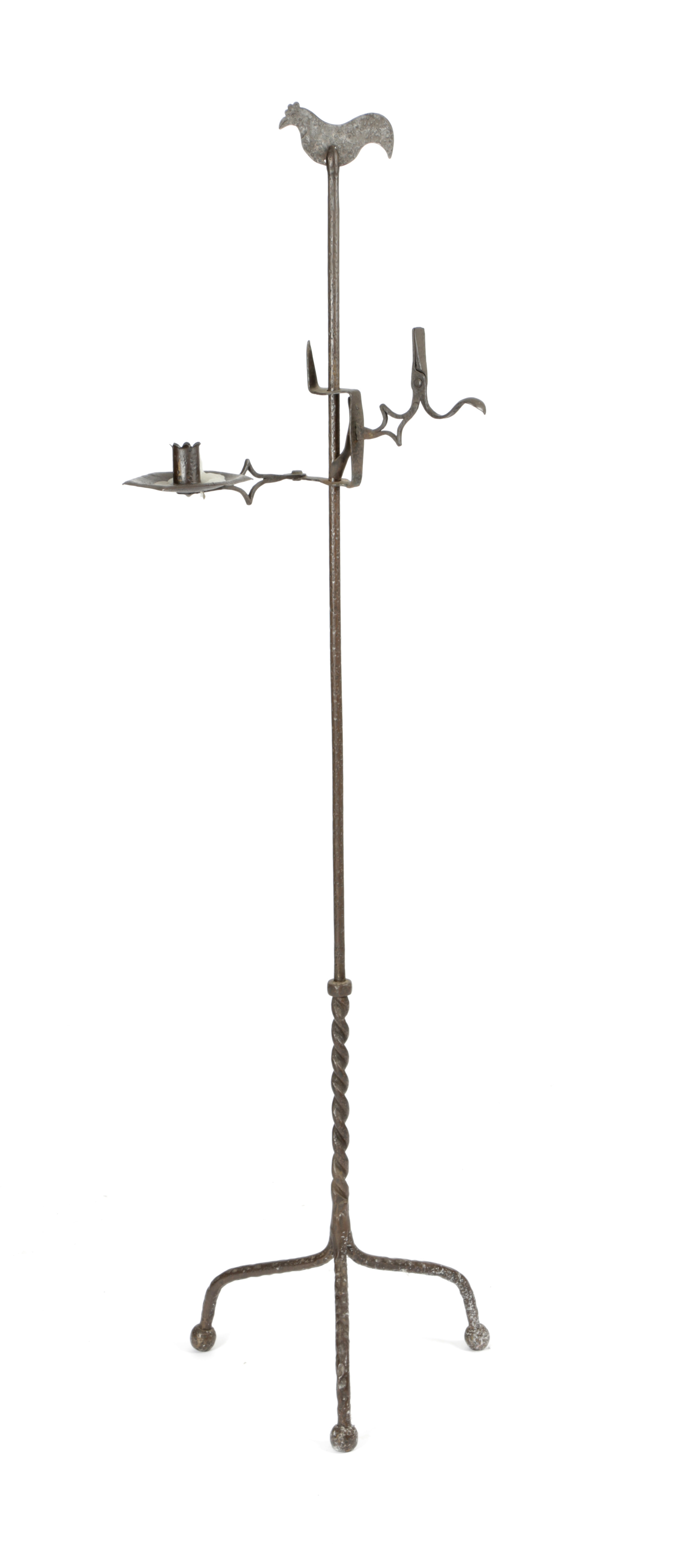 A WROUGHT IRON FLOOR STANDING ADJUSTABLE CANDLE HOLDER