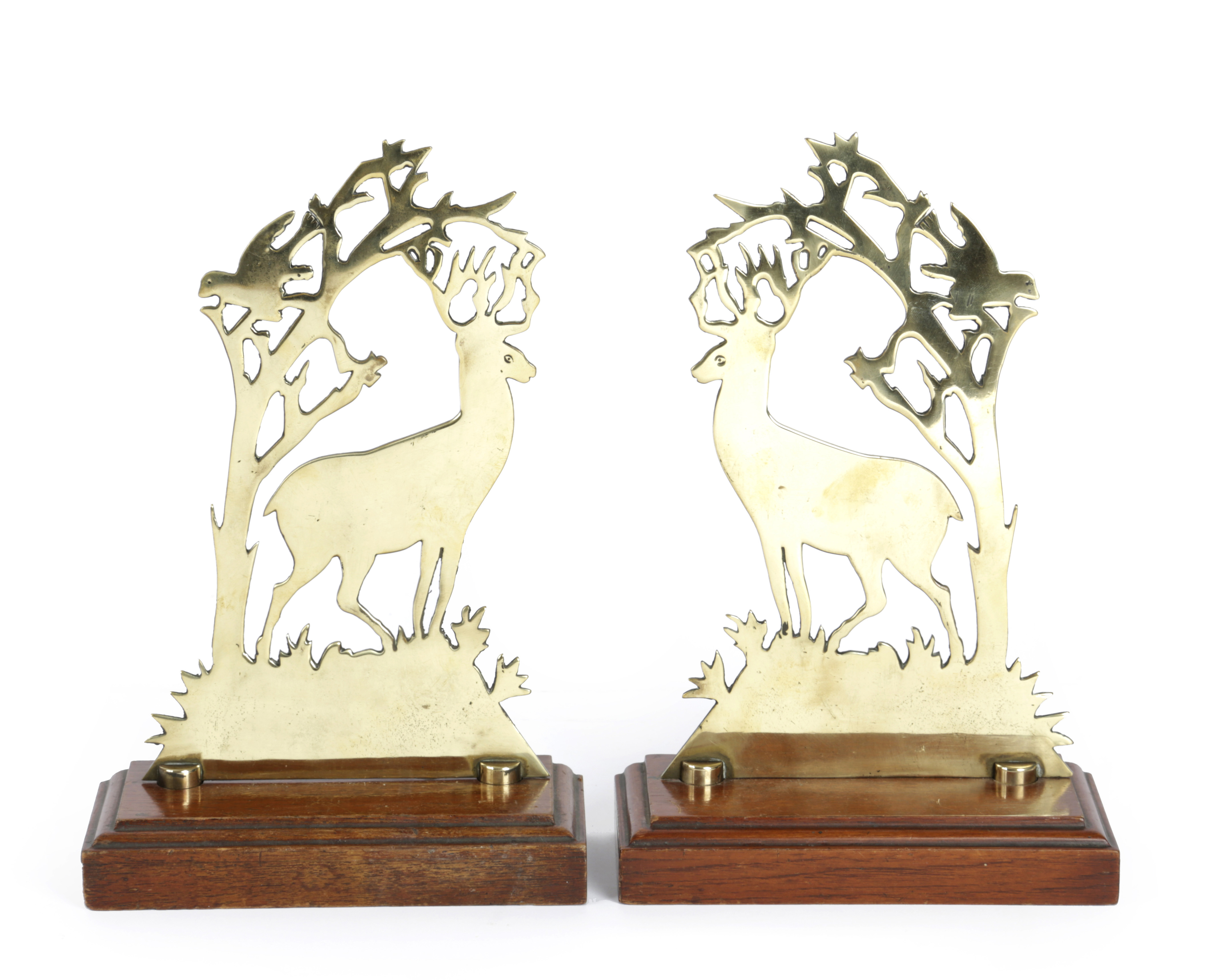 A PAIR OF FOLK ART BRASS STAG CHIMNEY ORNAMENTS