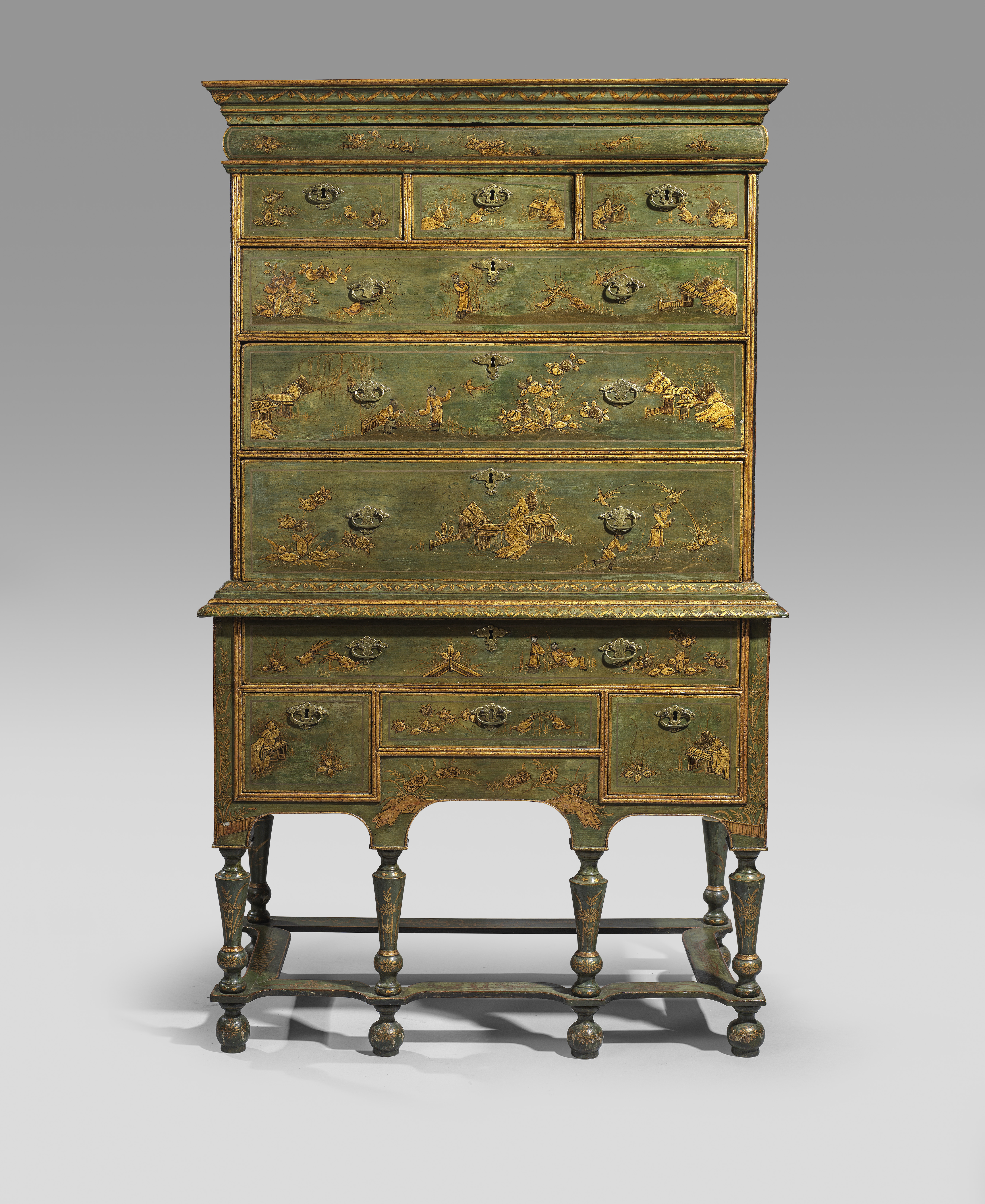 A RARE WILLIAM AND MARY GREEN JAPANNED CHEST ON STAND