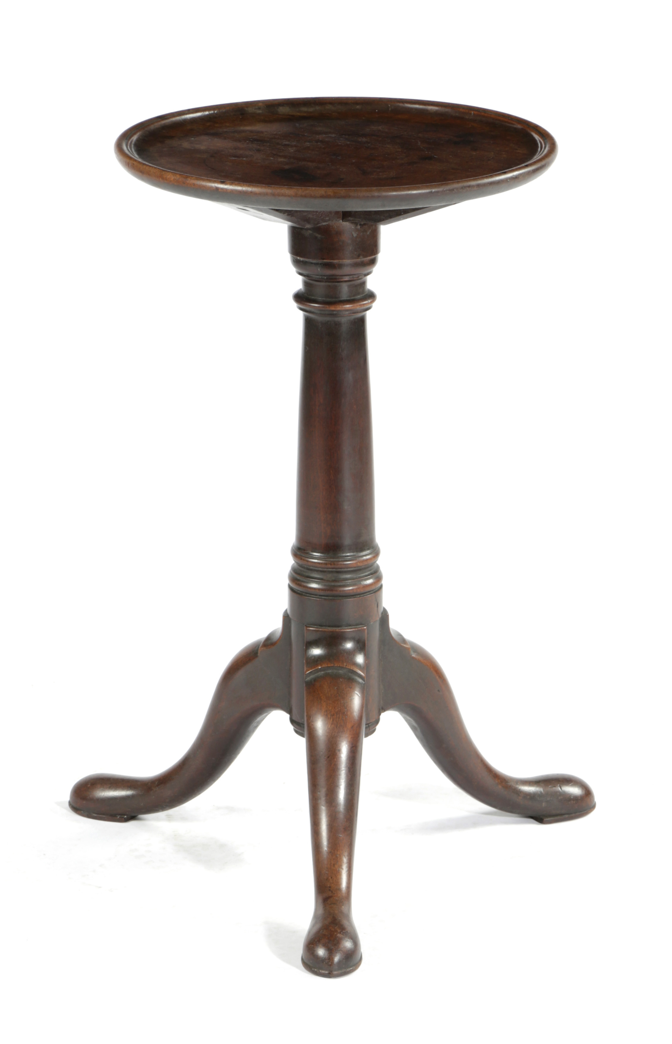 the circular dished fixed top on a turned gun barrel stem, on tripod cabriole legs and pad feet
