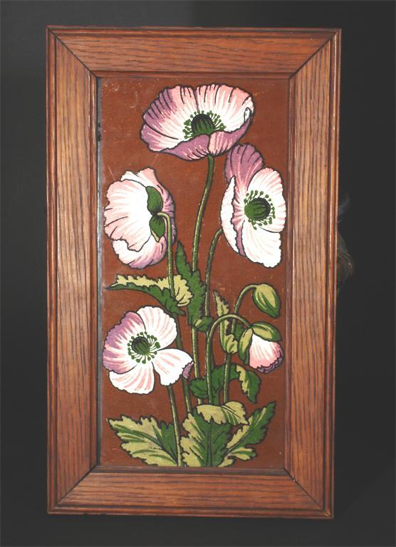 A Maw, Salopian tile panel painted with opium poppies in colours, framed moulded mark 30 x 18cm.