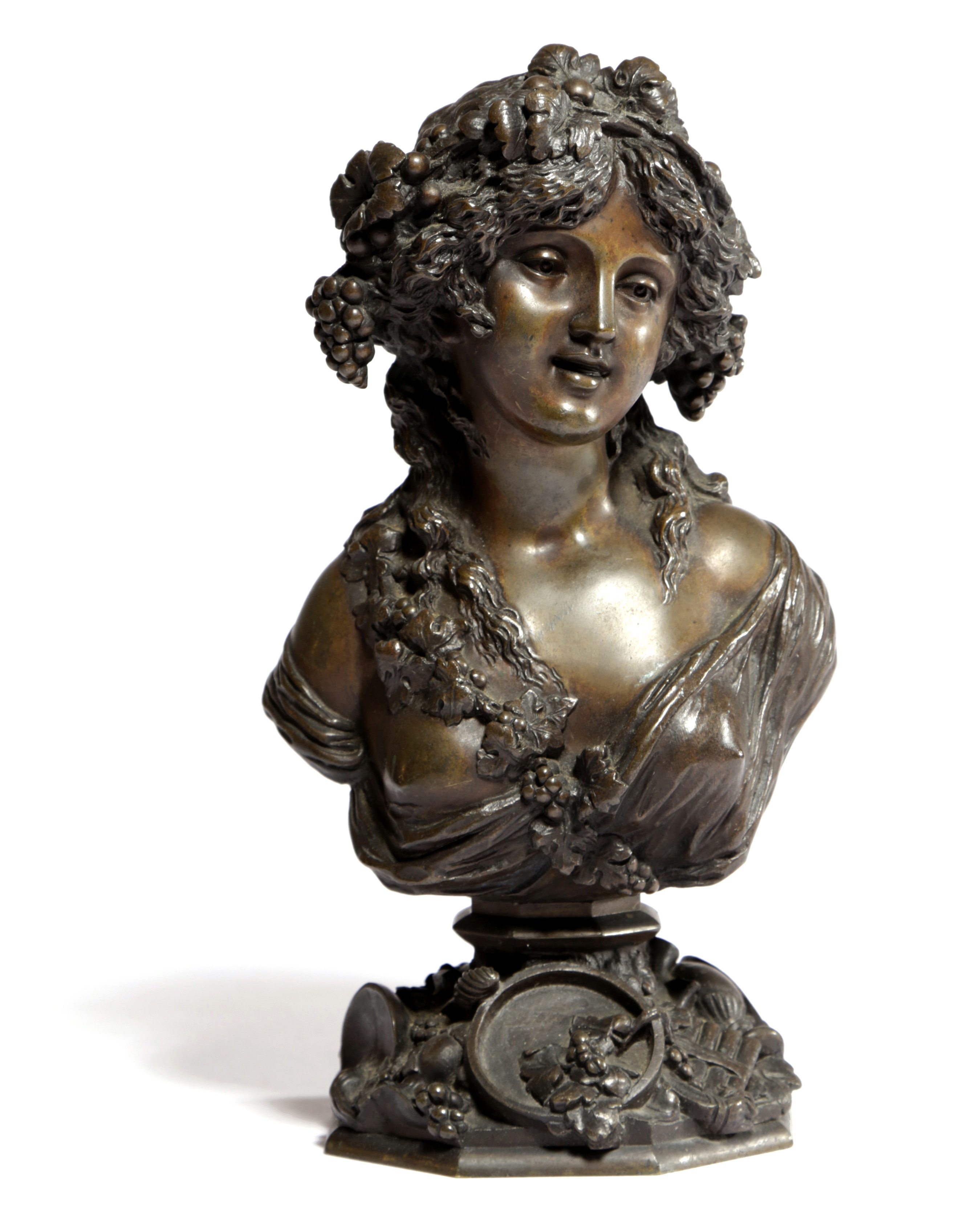 with a grapevine in her hair and draped over her right shoulder, the base strewn with a ewer, musical instruments, shells and a grapevine, signed 'Marin'