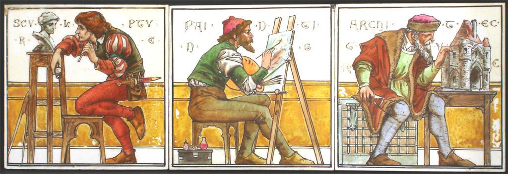 Five Shrigley & Hunt tiles depicting; Sculpture, Painting, Architecture, Music, and Metalwork, each painted in colours painted monogram to three, minor rim chips and paint loss 15.5 x 15.5cm.