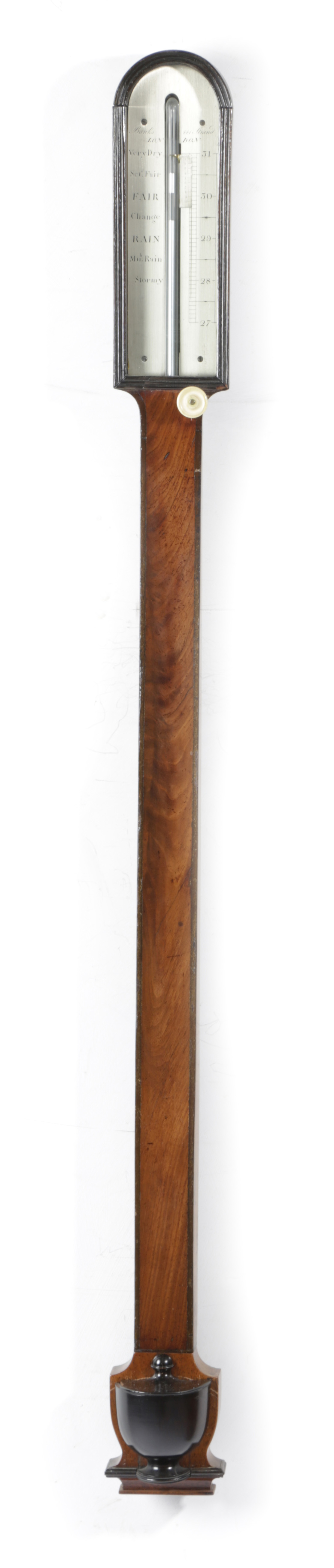 the silvered arch dial with an adjustable vernier scale, signed 'Banks 441 Strand London', with a turned bone adjuster, the case with reeded and banded decoration, with an ebonised urn reservoir cover