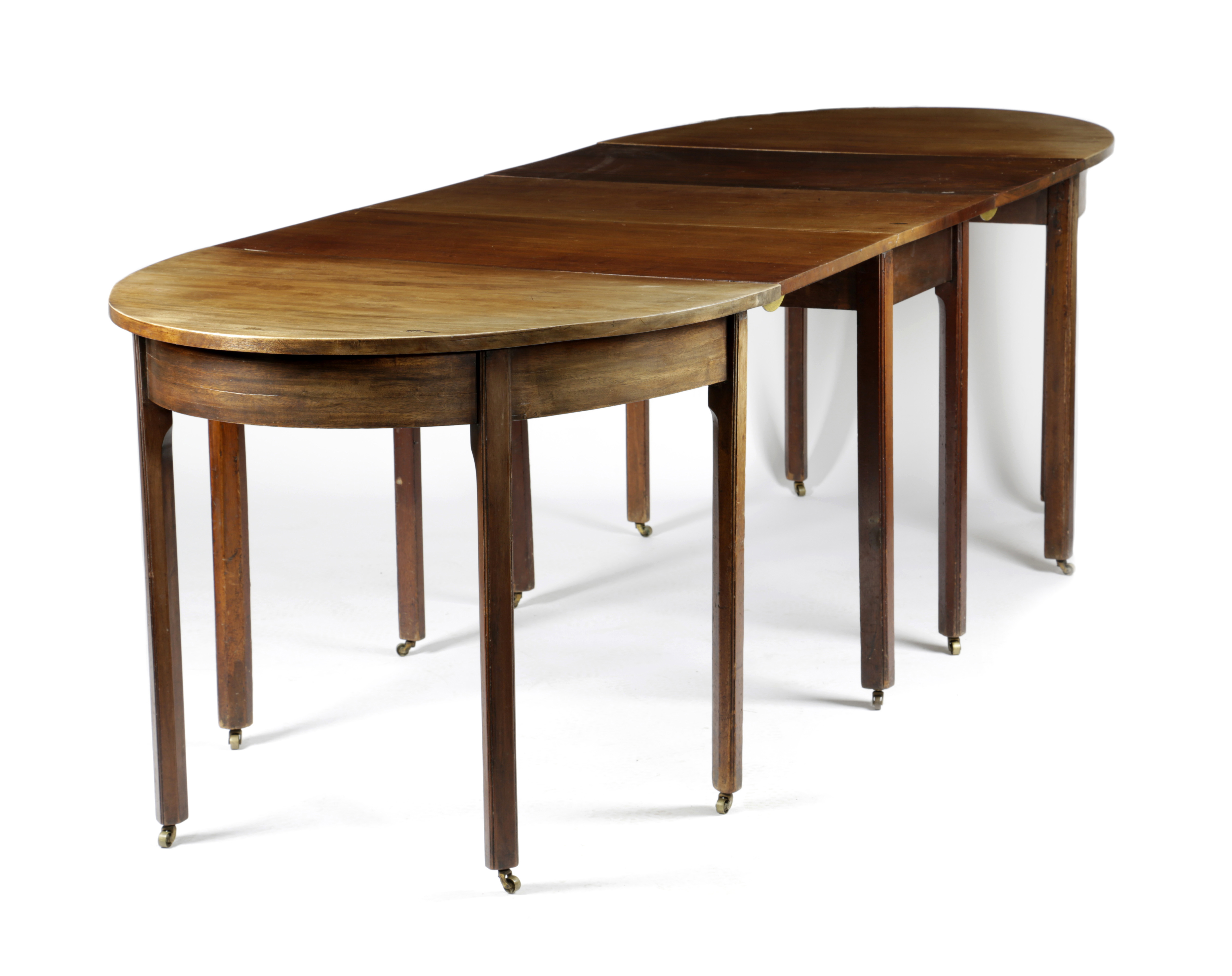 with a pair of 'D' ends and a central drop-leaf section, with an additional leaf, on moulded and chamfered legs and brass castors