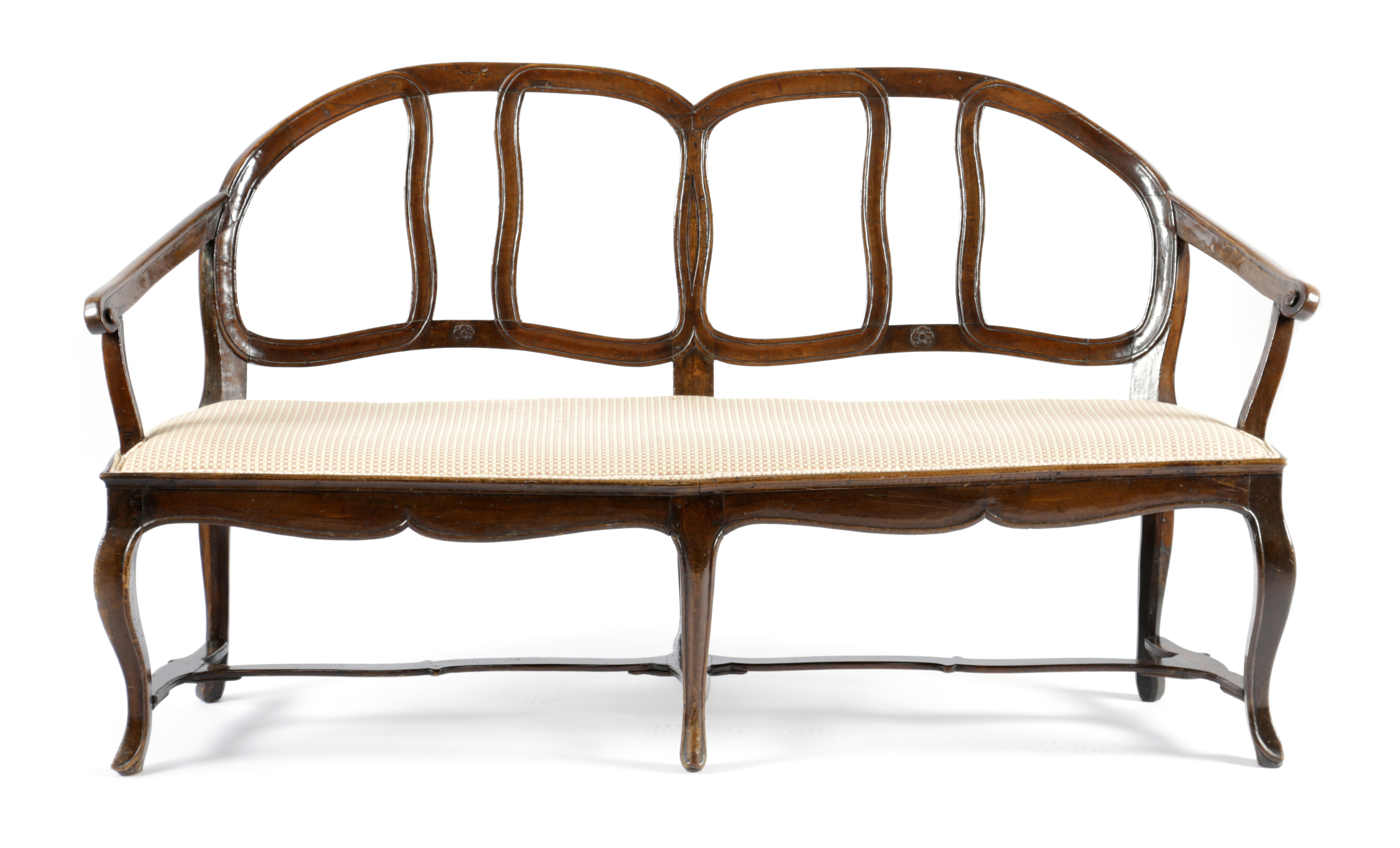 the moulded open frame above a later upholstered seat, an arc d'arbalete apron and on cabriole legs united by a flat shaped stretcher