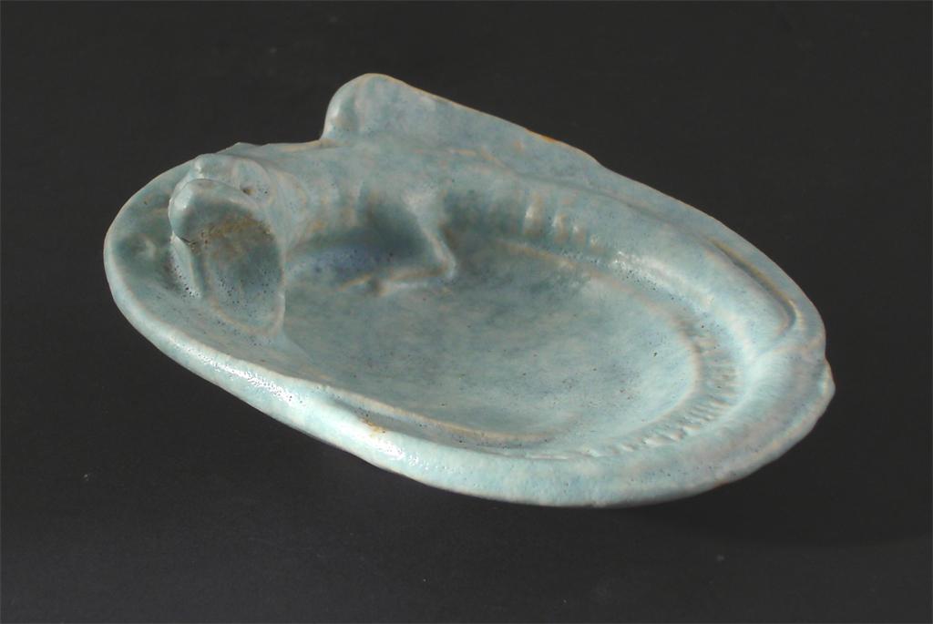A Burmantoft's Faience advertising dish the rim modelled with a dragon, covered in a mottled blue glaze impressed mark 13cm. wide.
