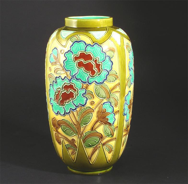 A Burmantoft's Faience vase modelled in low relief with flower and foliage panels, in shades of yellow, green and brown impressed marks, small chip to base rim 26.5cm. high