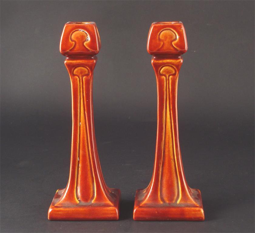 A pair of Burmantoft's Faience candlesticks model no.2219
