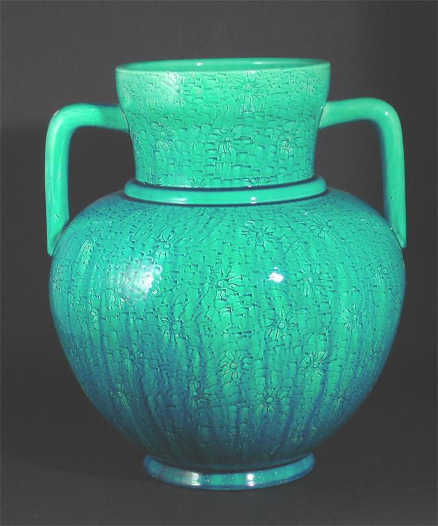 A Burmantoft's Faience large twin-handled vase model no.323, incised with geometric design, glazed blue impressed marks 41cm. high