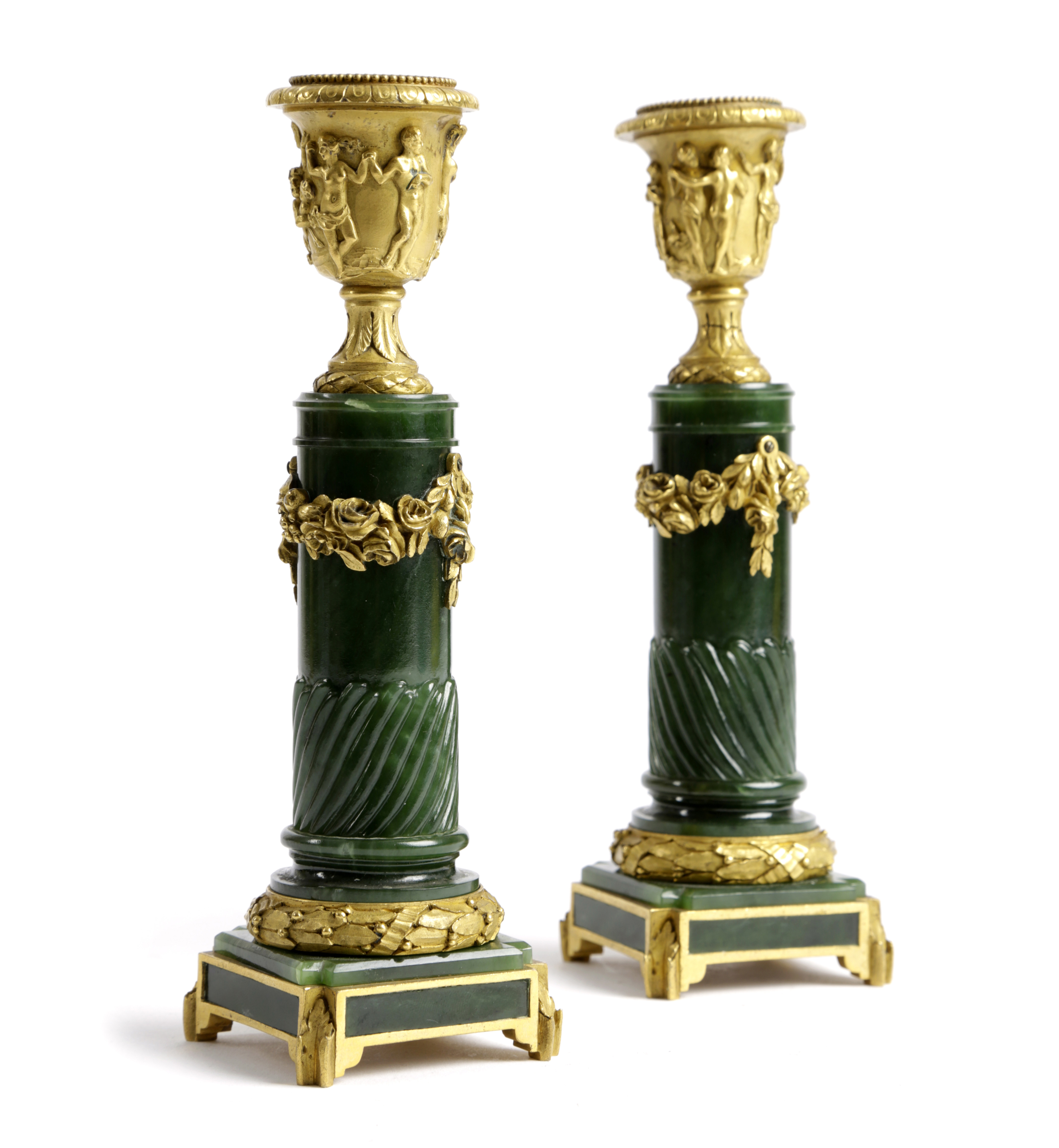 A PAIR OF NEPHRITE JADE AND ORMOLU CANDLESTICKS