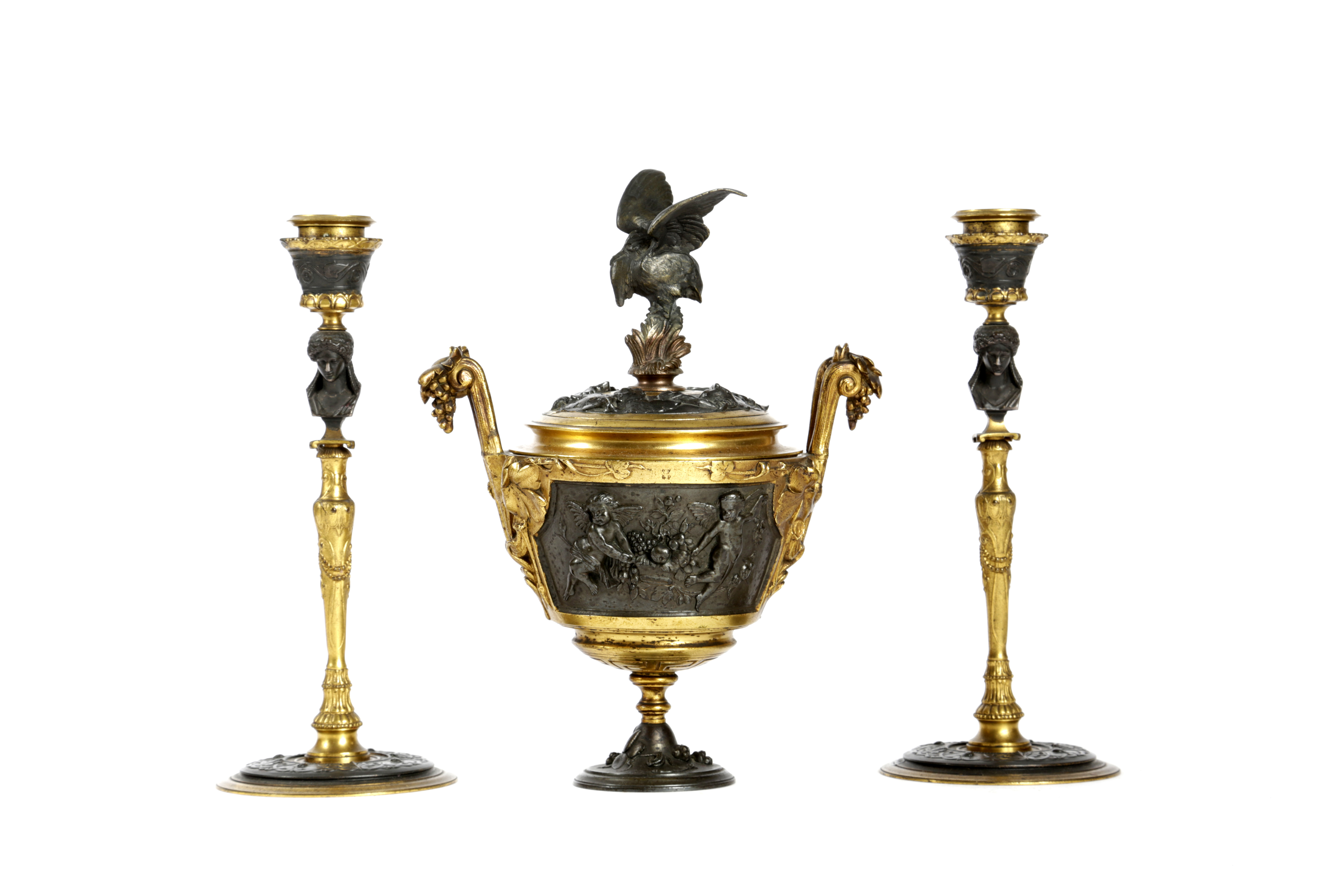 the lid with a pelican finial, the body decorated with panels of cherubs and with grapevine handles, stamped twice 'VP crowned', together with a pair of candlesticks in the similar manner, with classical busts and column stems (3)