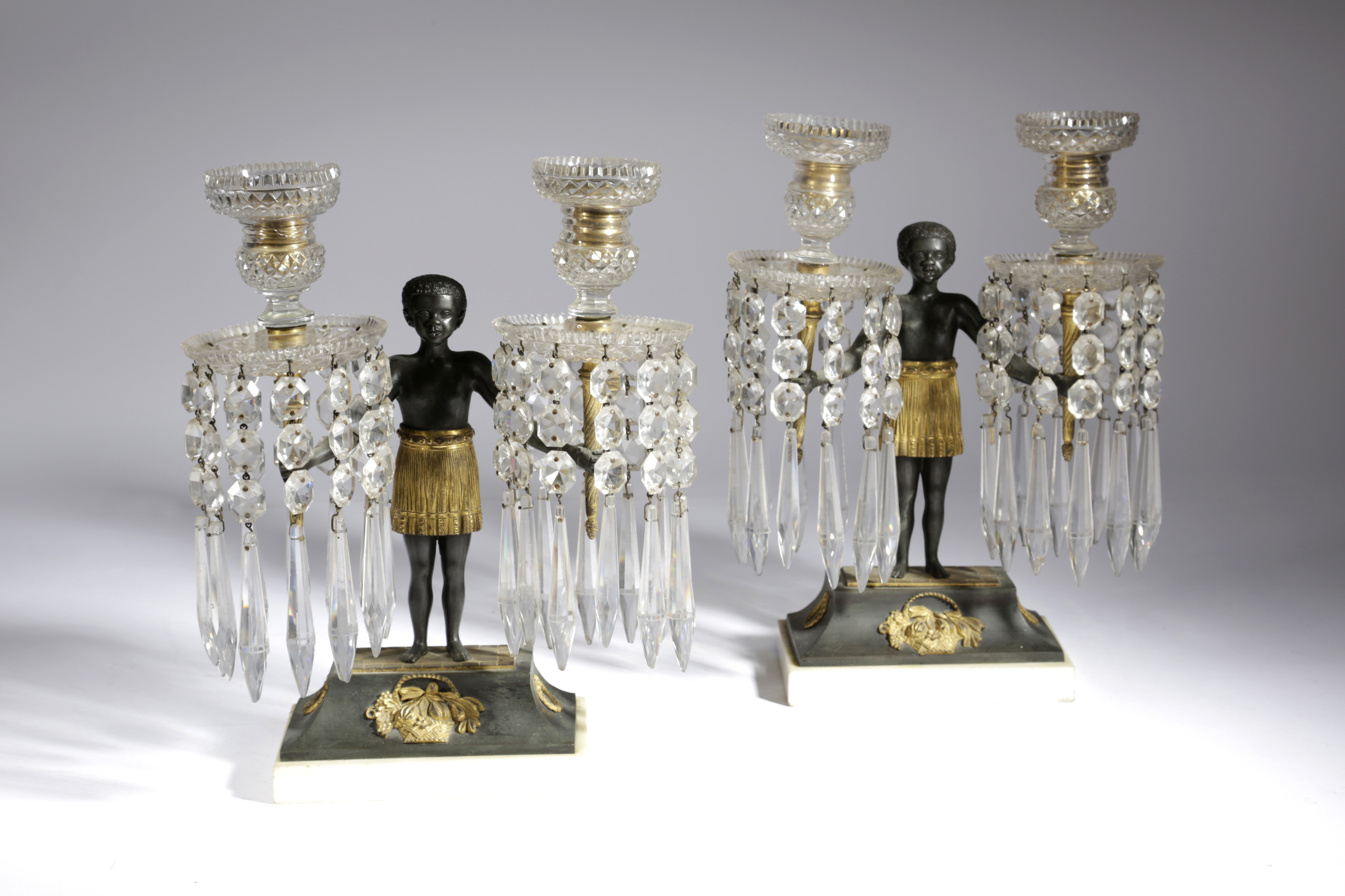 each with a standing blackamoor supporting a pair of torches, with cut-glass sconces and drip-pans, hung with faceted drops and lustres, the base decorated with a basket of fruit and flowers and two laurel leaves, on a marble plinth (2)