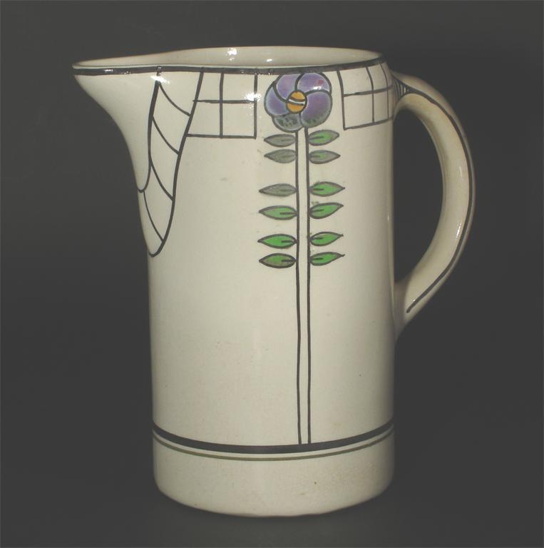 A Scottish earthenware jug the decoration attributed to E A Bough, painted with purple flower stems painted 9 to base 25cm. high